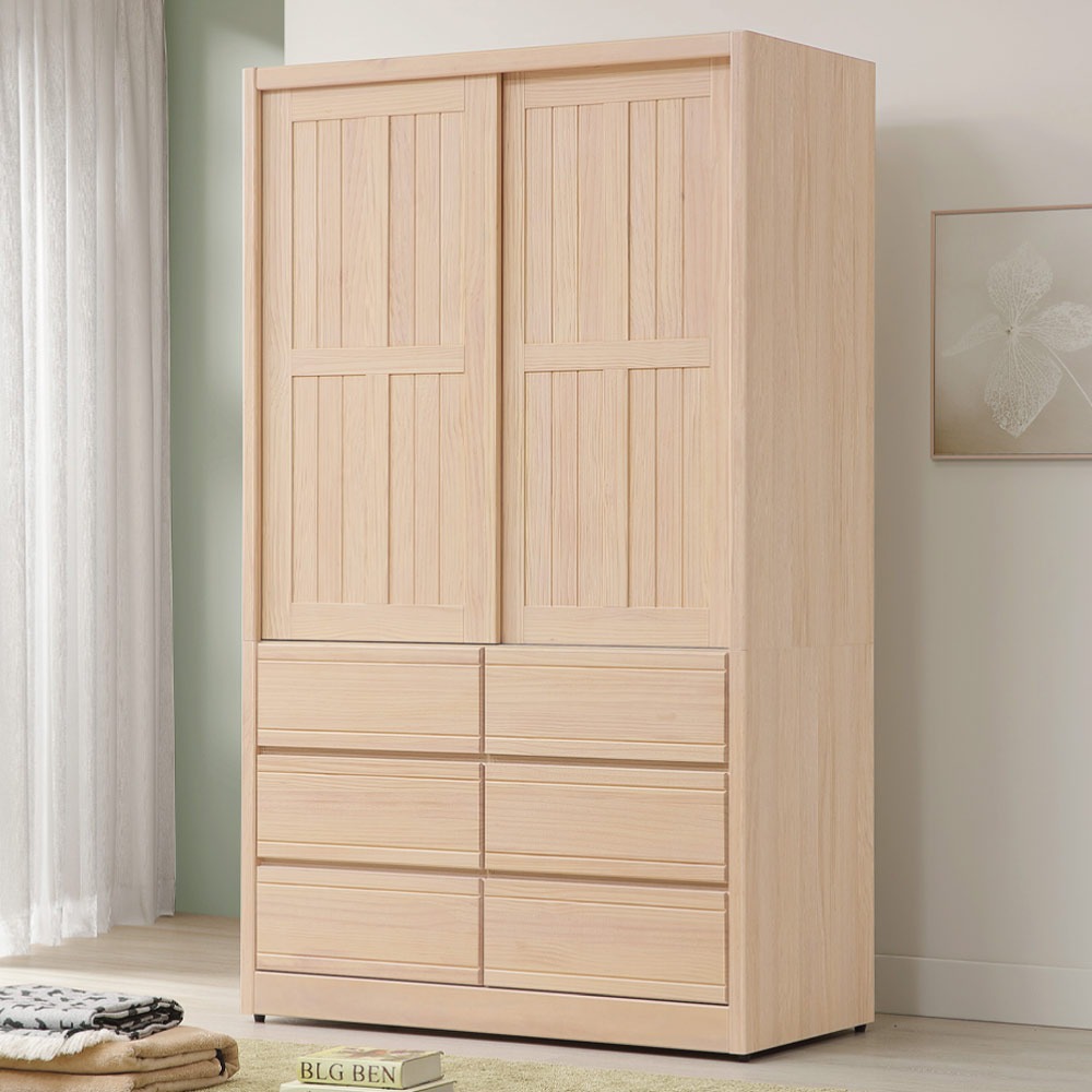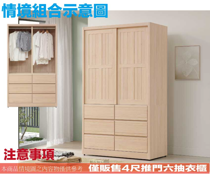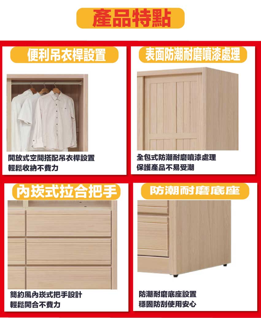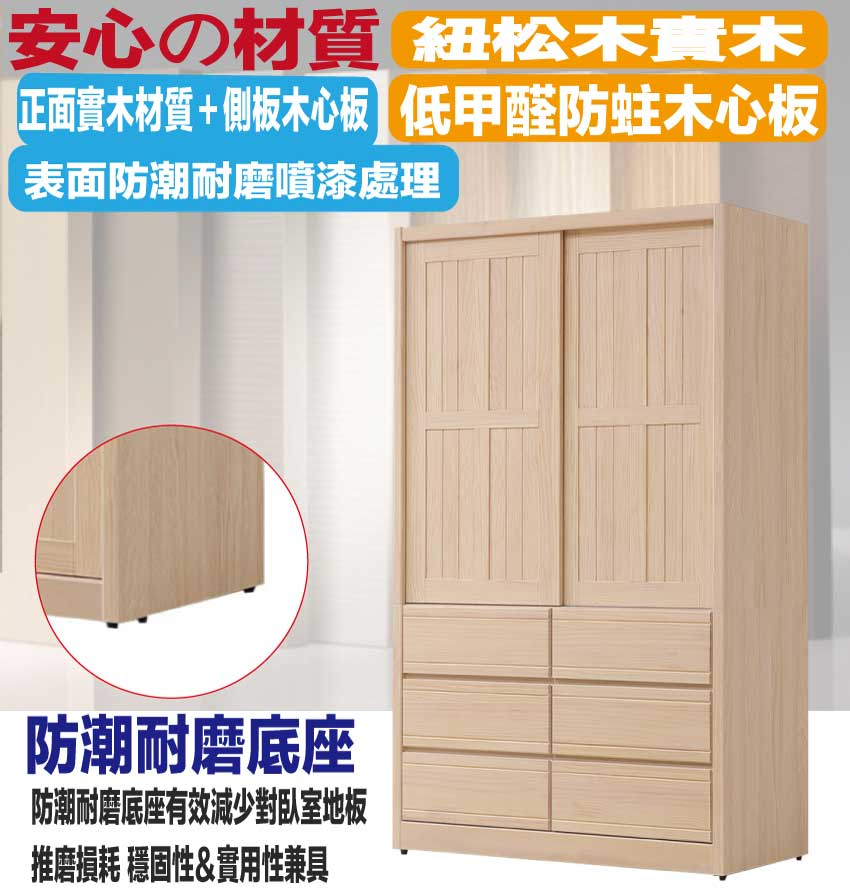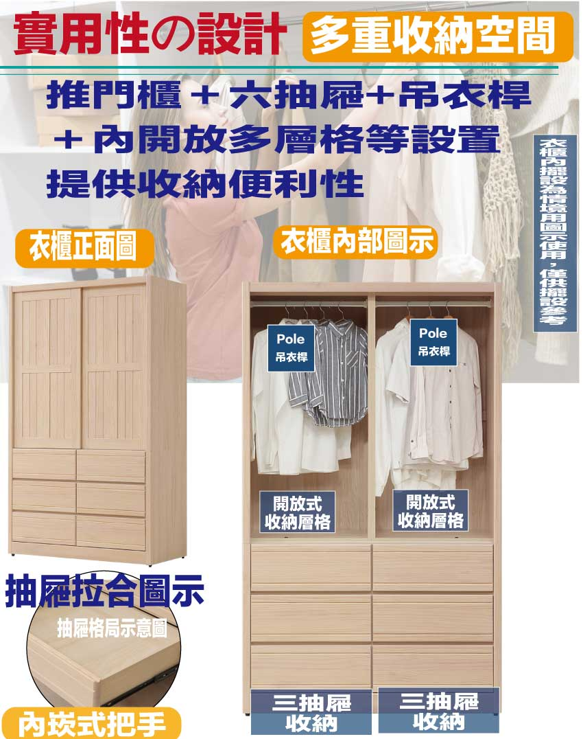 洗白木紋色系+安心材質製造,使用放心+搭配居家更便利,採用紐松木實木+防蛀木心板+實木防磨底座+五金滑軌結構等安心材質製造 ,外層採用防潮耐磨噴漆處理搭配採用推門櫃+吊衣桿+六抽屜+內開放層格等收納空間設計,全由專人配送到家,專業安心服務,替你省下更多時間!