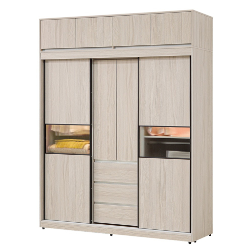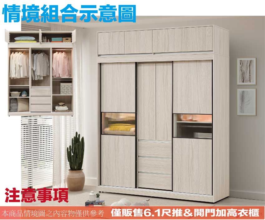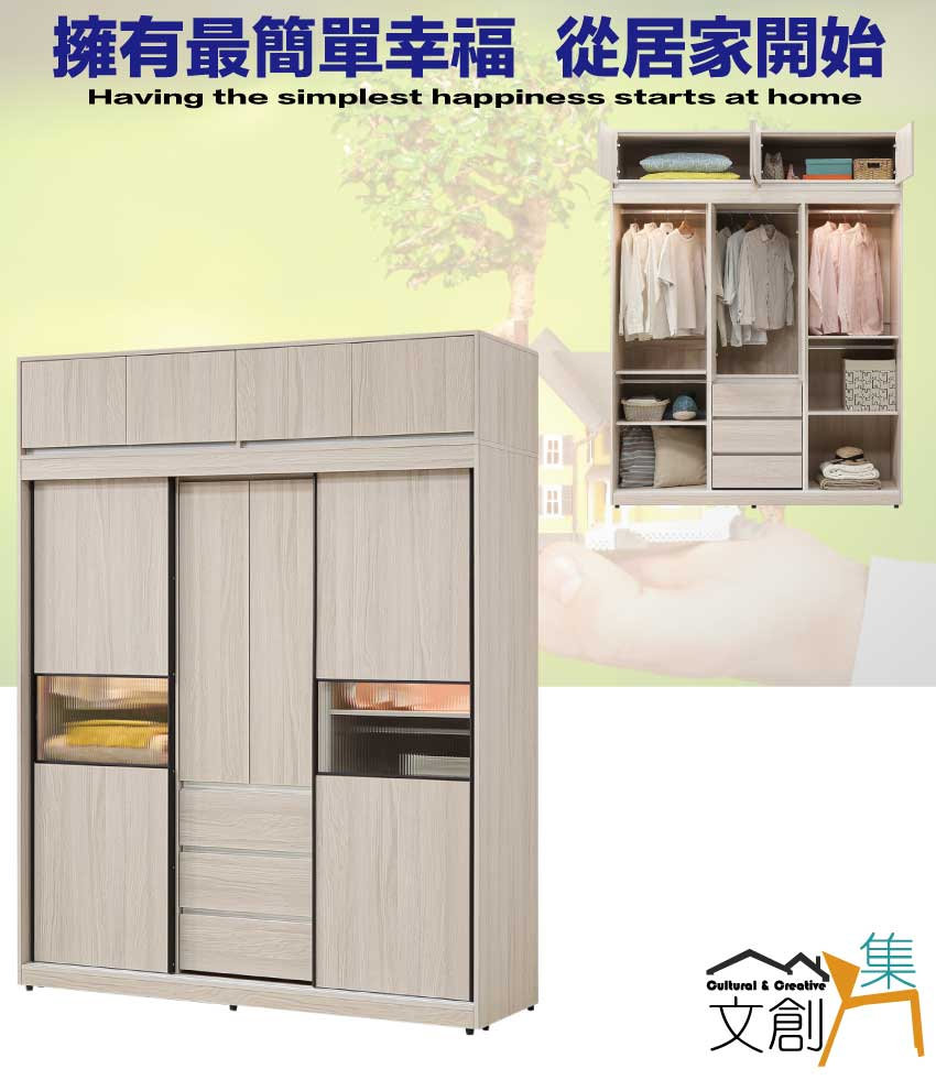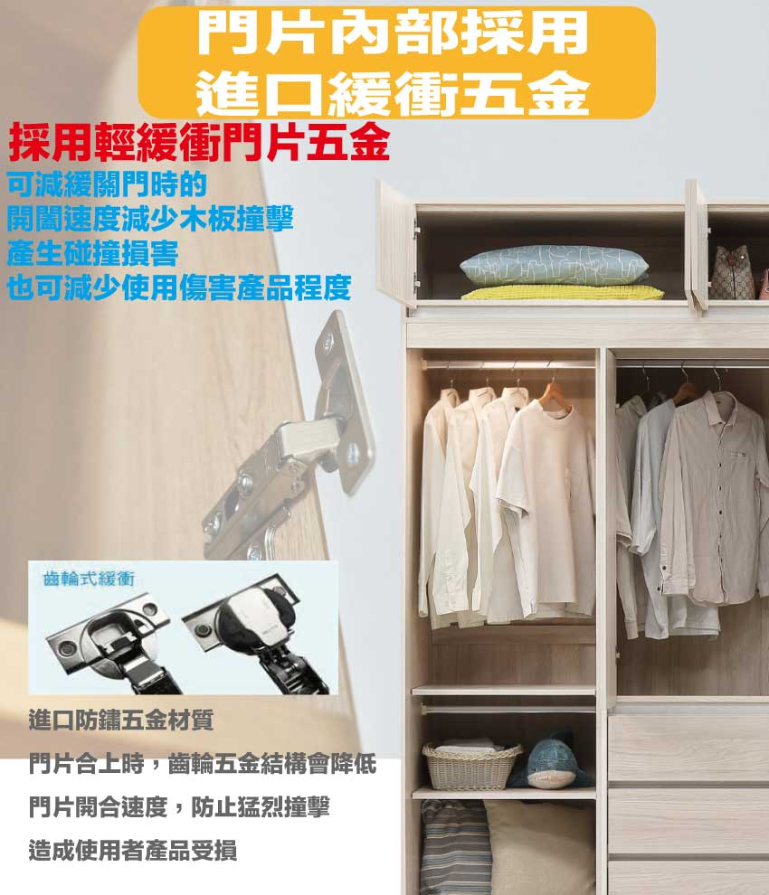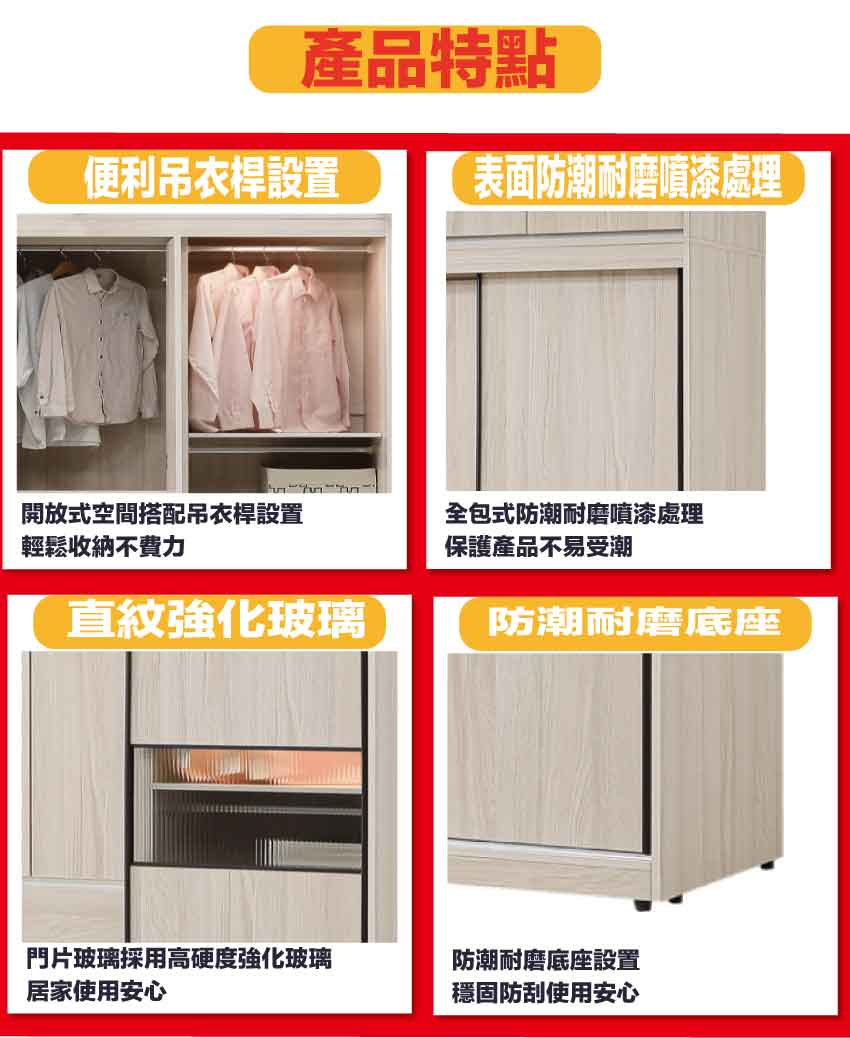 淺橡木紋色系+安心材質製造,使用放心+搭配居家更便利,採用防蛀木心板+防潮耐磨底座+五金滑軌結構+防夾手緩衝門片五金+5mm直紋強化玻璃等安心材質製造 ,外層採用防潮耐磨噴漆處理搭配採用開門櫃&推門櫃+吊衣桿+三抽屜+內開放層格等收納空間設計,全由專人配送到家,專業安心服務,替你省下更多時間!