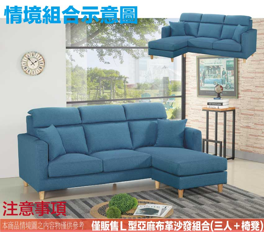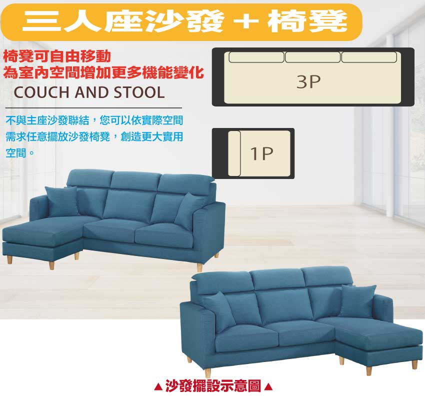 此組L型沙發椅為三人座+椅凳組合,椅凳可視使用需求自由擺放增加居家空間變化便利性