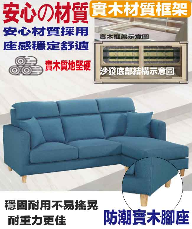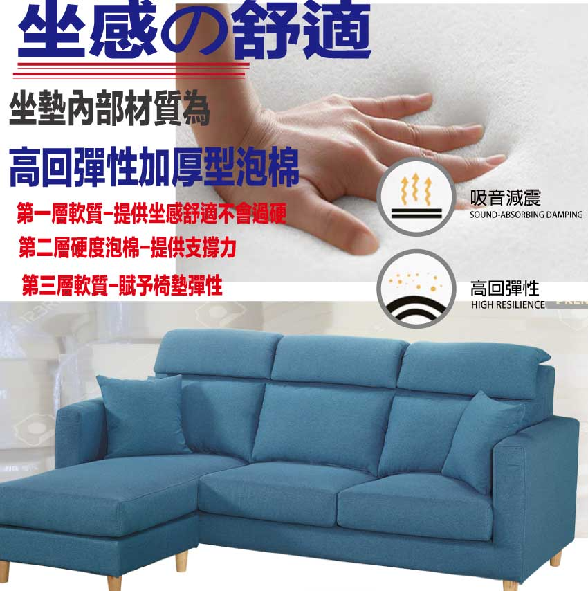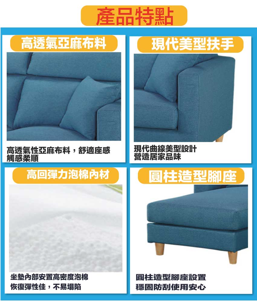 藍色系+現代美型外觀+安心材質製造,就是這種頂級質感的設計,能輕鬆地融入各種空間風格,採用內部實木框架+防潮實木腳座+透氣亞麻布+高回彈力加厚泡棉等安心材質製造,品質安心有保障,現在購買專人送到府服務,免組裝+免運費,讓你省時省力省運費!