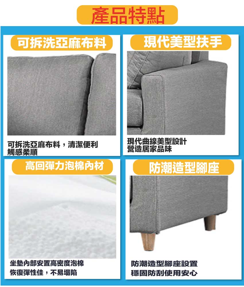 現代灰色系+安心材質製造,使用放心+搭配居家更便利,採用內部實木板材框架+防潮木紋腳座+透氣亞麻布(可拆洗)+高回彈泡棉等安心材質製造 ,全由專人配送到家,專業安心服務,替你省下更多時間!