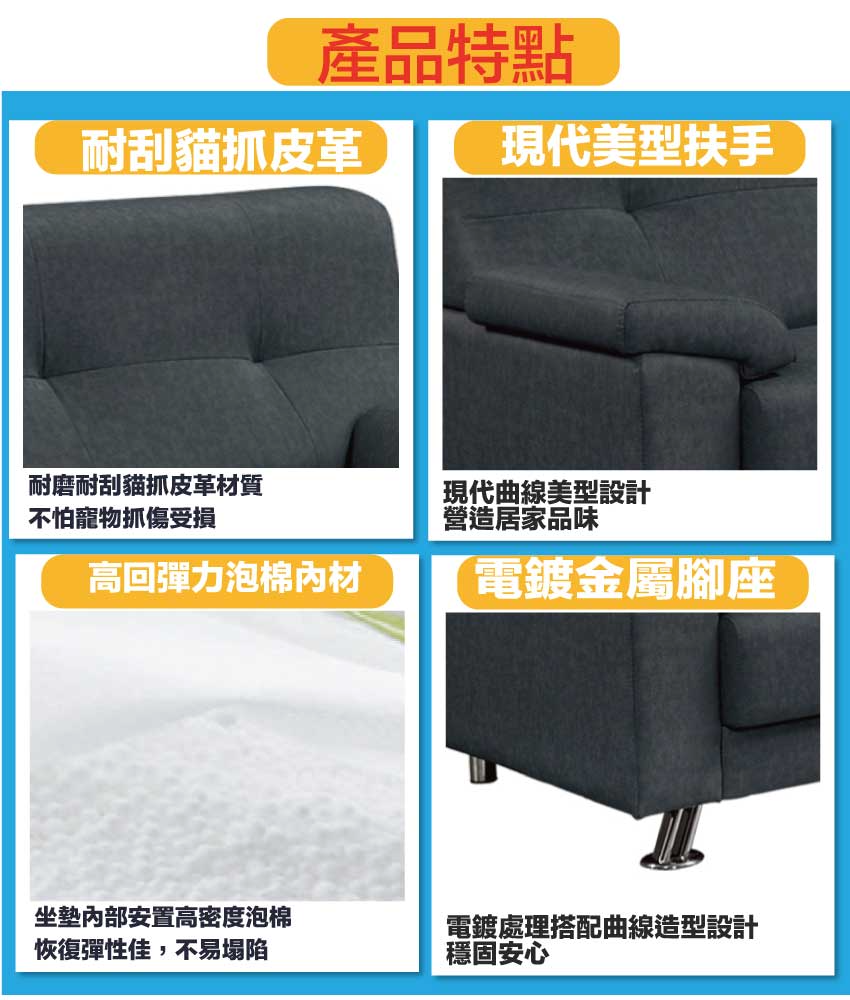 現代深灰色系+安心材質製造,使用放心+搭配居家更便利,採用內部實木底框+電鍍金屬腳座+耐磨貓抓皮革+高回彈泡棉等安心材質製造 ,全由專人配送到家,專業安心服務,替你省下更多時間!
