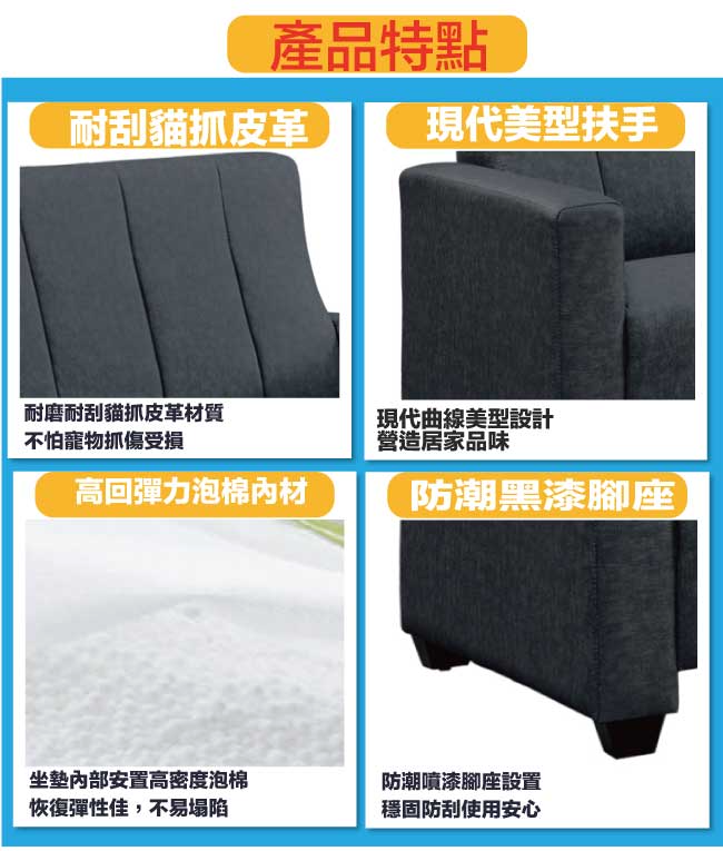 採用內部實木底框+防潮黑漆腳座+耐磨貓抓皮革+高回彈泡棉等安心材質製造