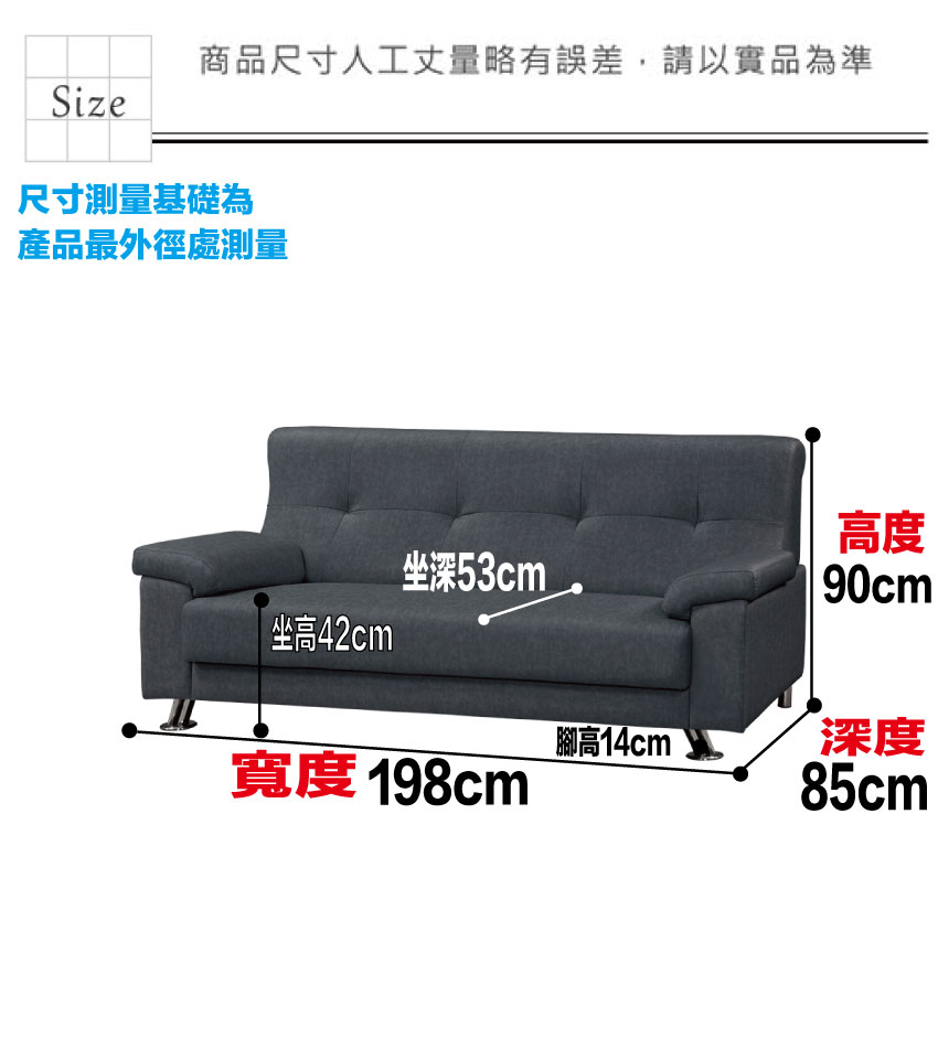 - 3人沙發椅尺寸:(寬)198x(深)85(高)90/公分