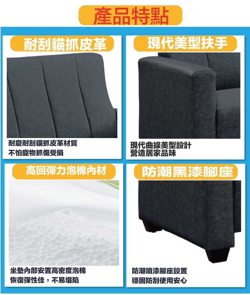 現代深灰色系+安心材質製造,使用放心+搭配居家更便利,採用內部實木底框+防潮黑漆腳座+耐磨貓抓皮革+高回彈泡棉等安心材質製造 ,全由專人配送到家,專業安心服務,替你省下更多時間!
