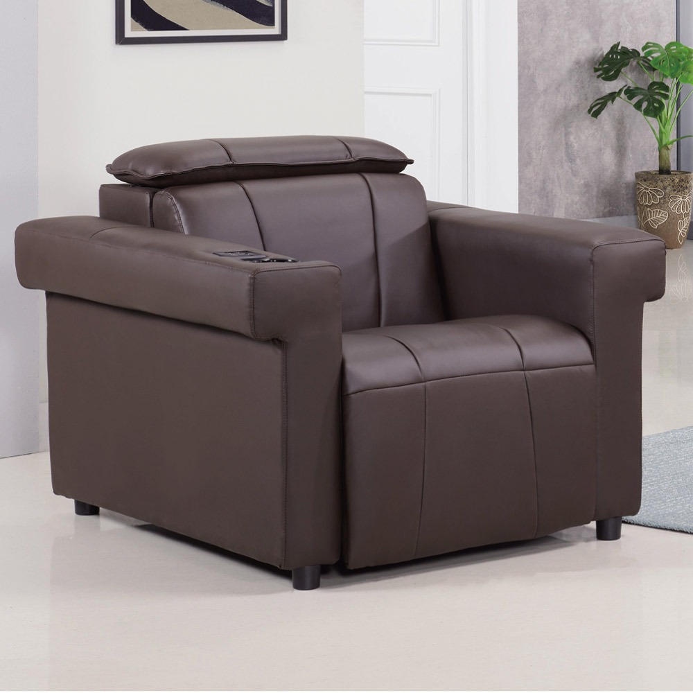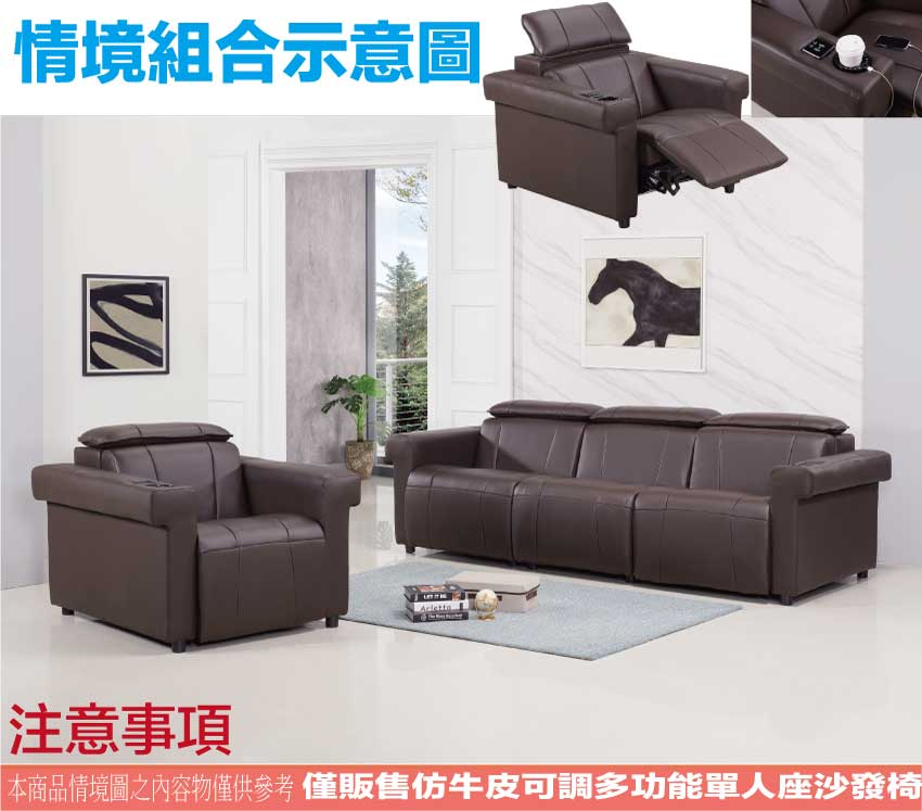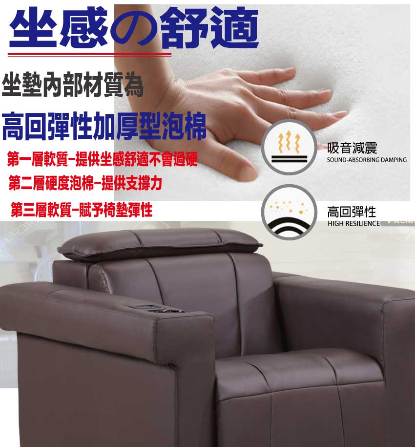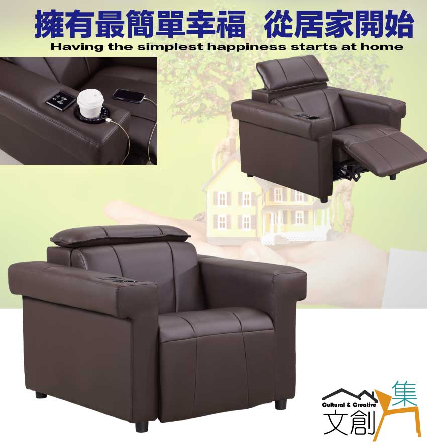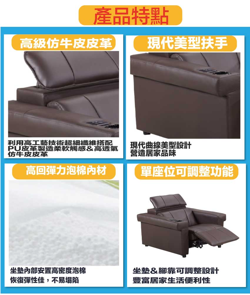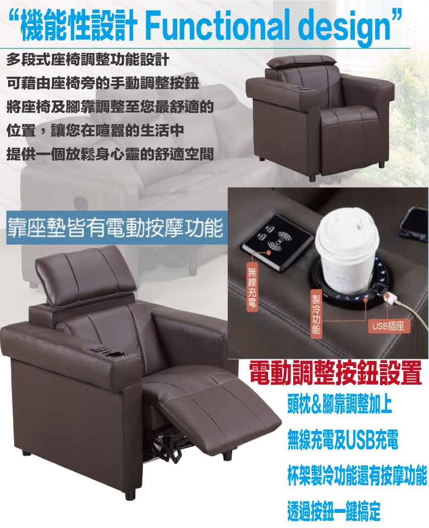 本沙發為多功能設計,可藉由扶手上按鈕調整以下功能:可替手機無線充電+沙發背部按摩+座椅可調背靠&腳靠+杯架製冷等多功能設計
