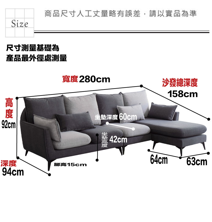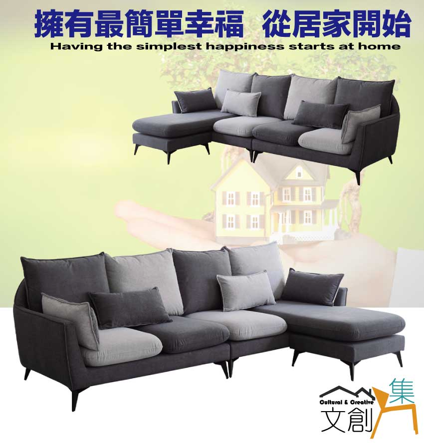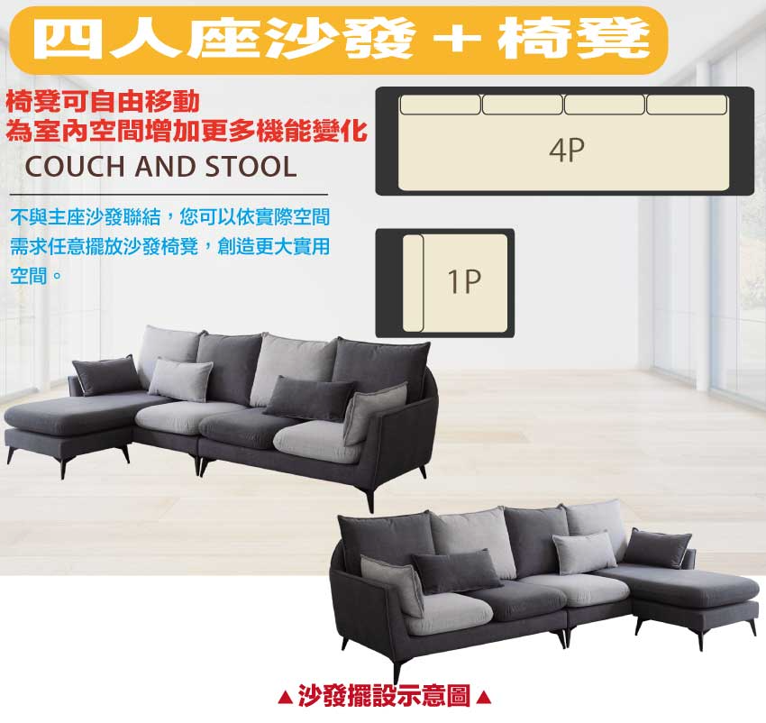 此組L型沙發椅為四人座+椅凳組合,椅凳可視使用需求自由擺放增加居家空間變化便利性