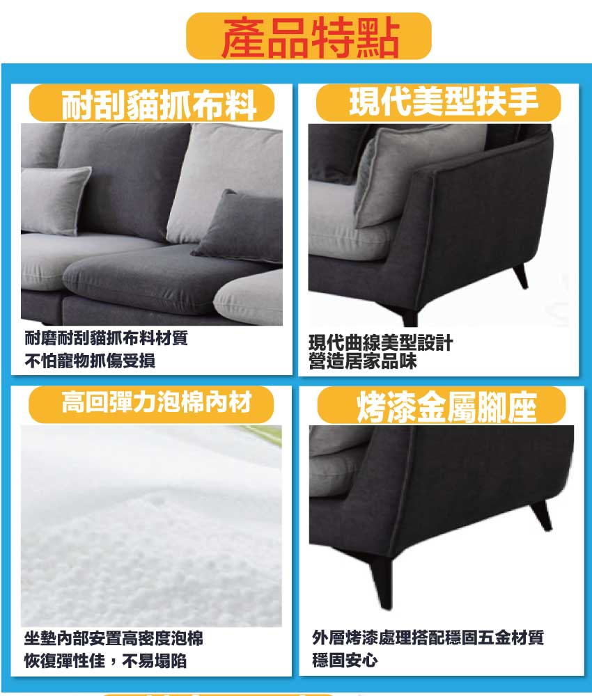 採用內部實木板材框架+烤漆金屬腳座+耐磨貓抓布+高回彈力加厚泡棉等安心材質製造