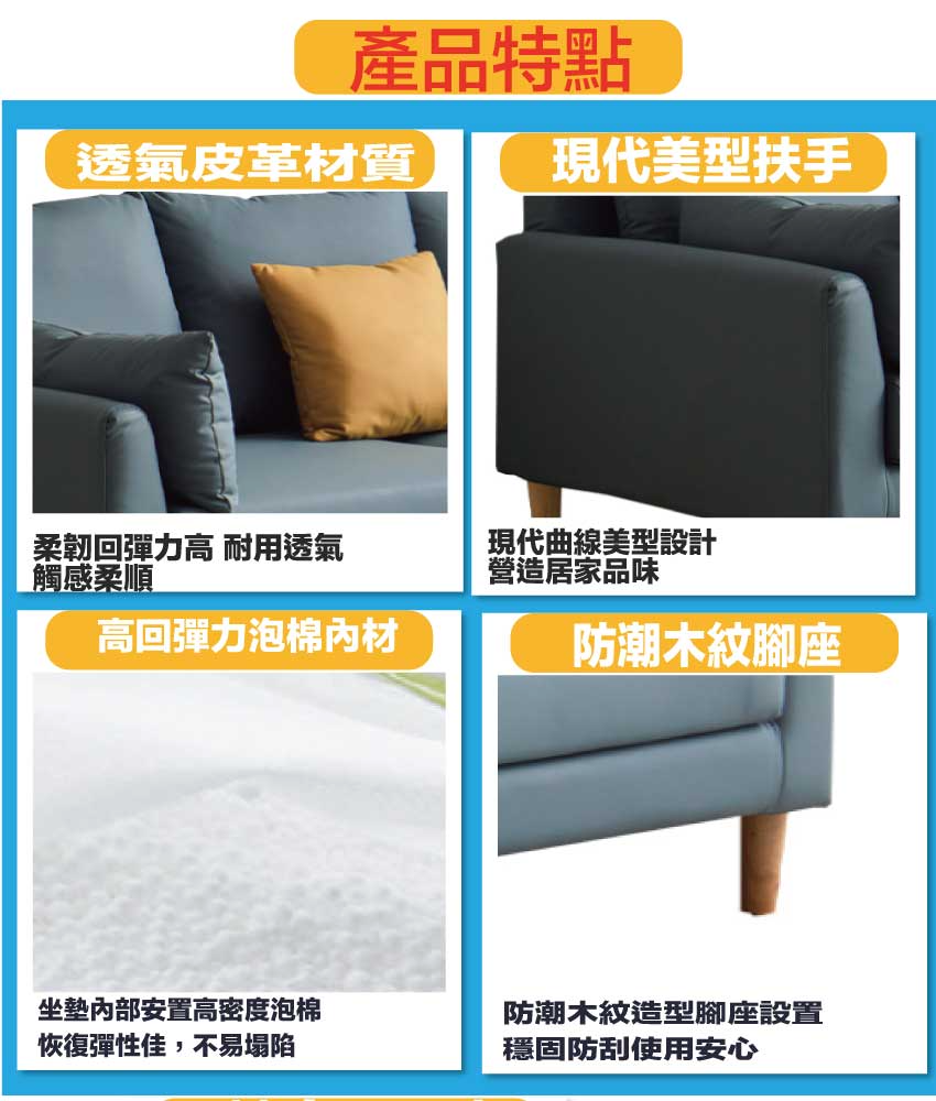 現代灰色系+安心材質製造,使用放心+搭配居家更便利,採用內部實木板材底框+防潮木紋腳座+透氣柔韌皮革+高回彈泡棉等安心材質製造 ,全由專人配送到家,專業安心服務,替你省下更多時間!