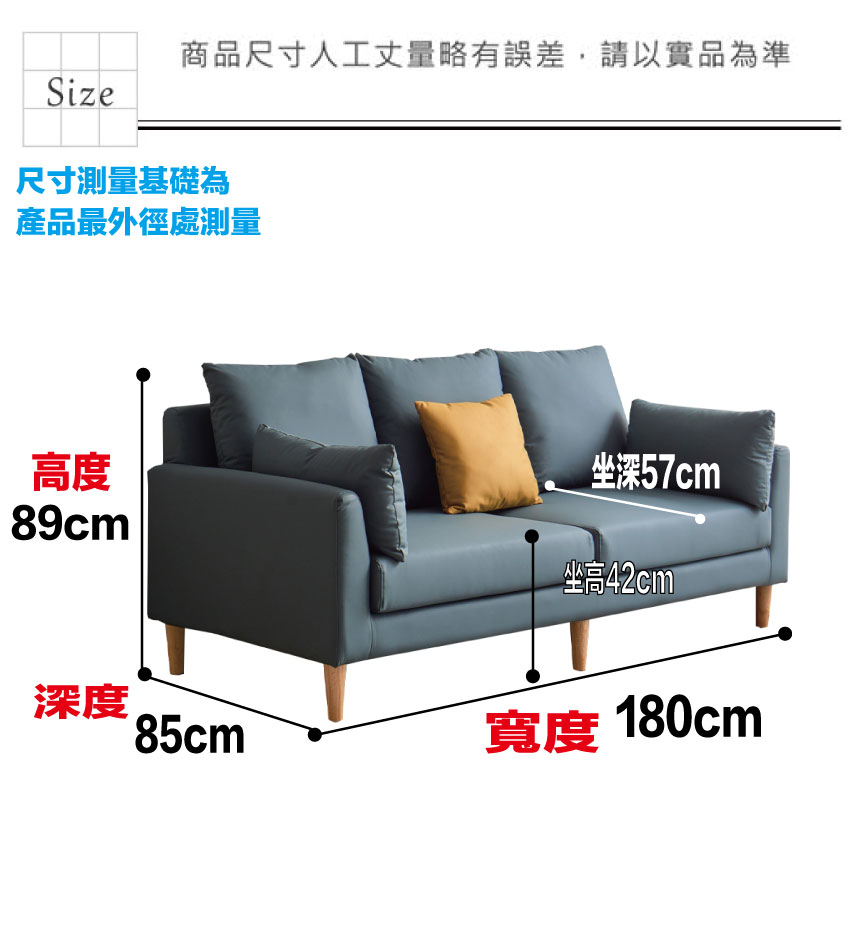 - 沙發尺寸:(寬)180x(深)85x(高)89/公分