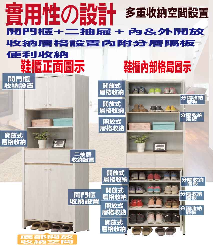 搭配採用開門櫃+二抽屜+內&外開放層格等收納空間設計