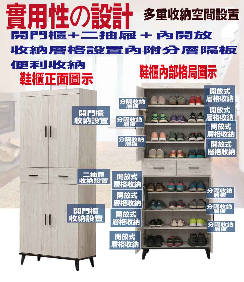 搭配採用開門櫃+二抽屜+內&外開放層格等收納空間設計