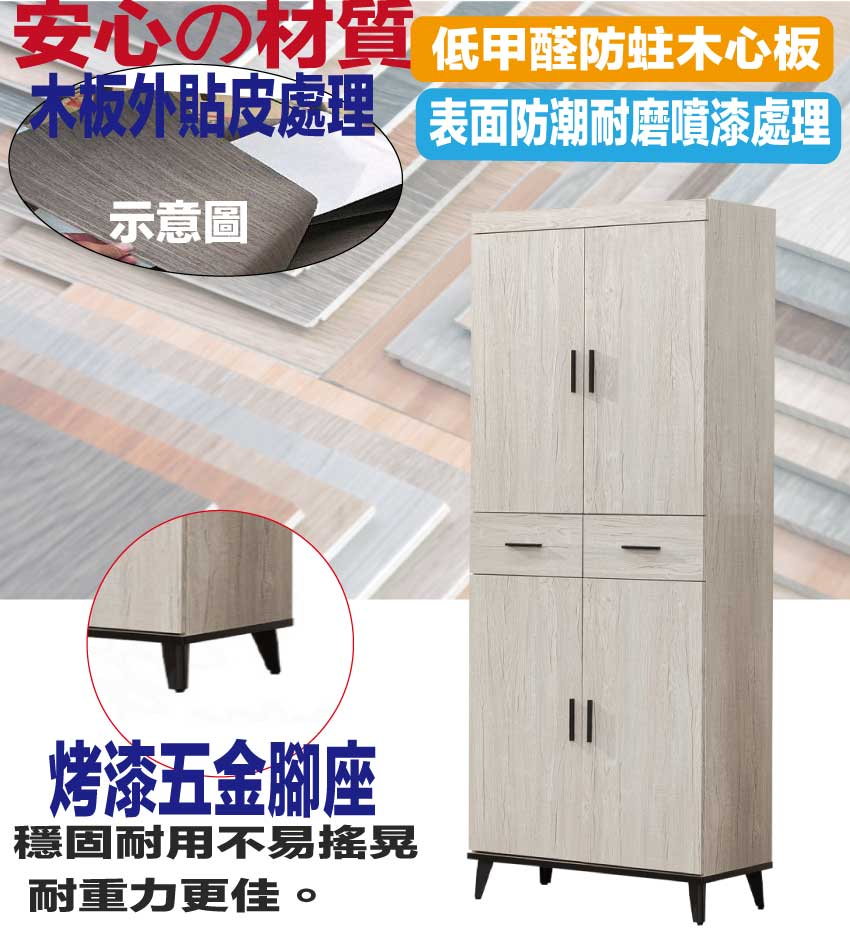 採用防蛀木心板+烤漆五金腳座+五金滑軌結構+防夾手緩衝門片五金等安心材質製造
