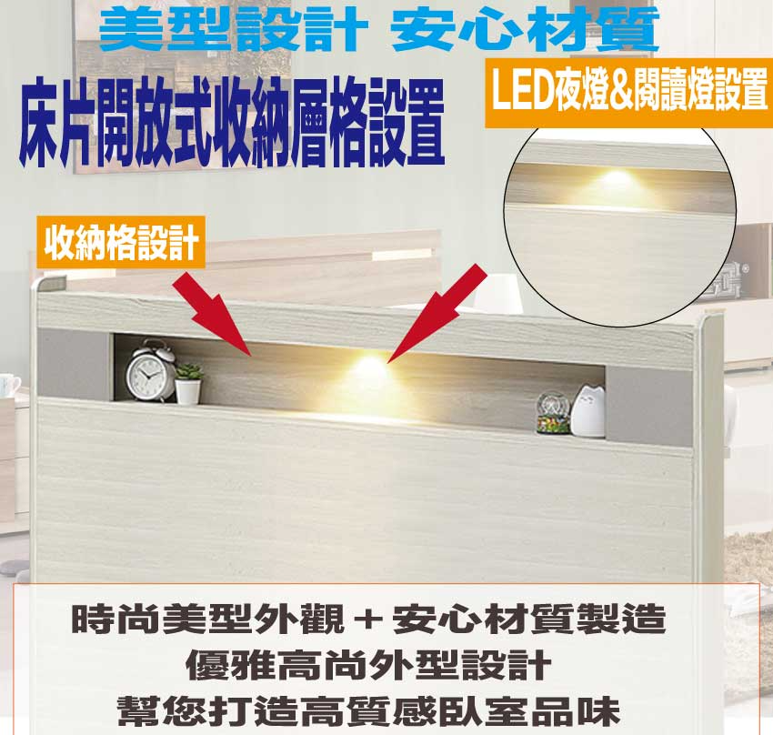 淺橡木紋色系+安心材質製造,使用放心+搭配居家更便利,採用防蛀木心板+防潮耐磨底座等安心材質製造 ,外層採用防潮耐磨噴漆處理搭配床頭片採用開放式層格+LED夜燈設置等收納空間設計,全由專人配送到家,專業安心服務,替你省下更多時間!