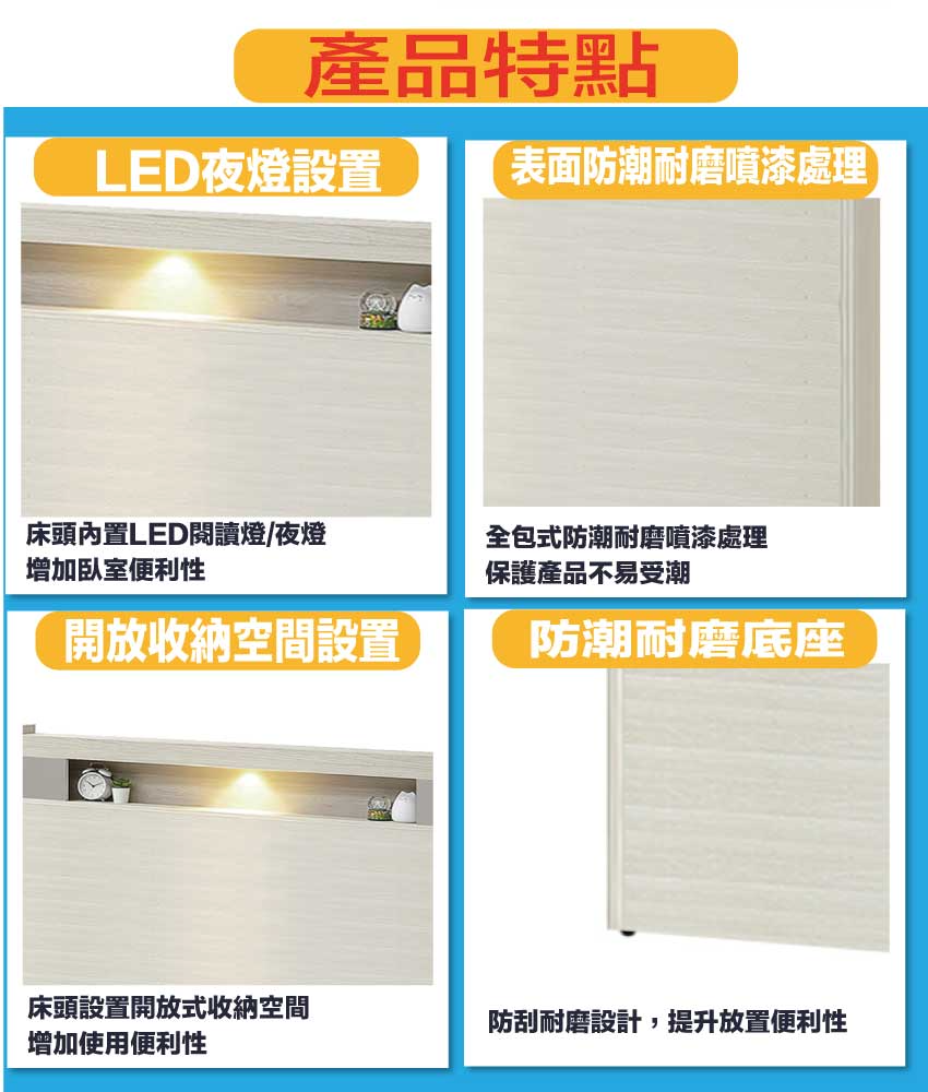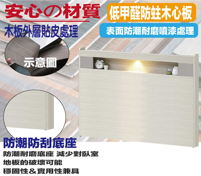 淺橡木紋色系+安心材質製造,使用放心+搭配居家更便利,採用防蛀木心板+防潮耐磨底座等安心材質製造 ,外層採用防潮耐磨噴漆處理搭配床頭片採用開放式層格+LED夜燈設置等收納空間設計,全由專人配送到家,專業安心服務,替你省下更多時間!