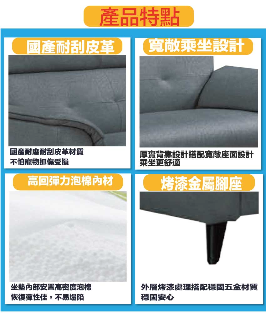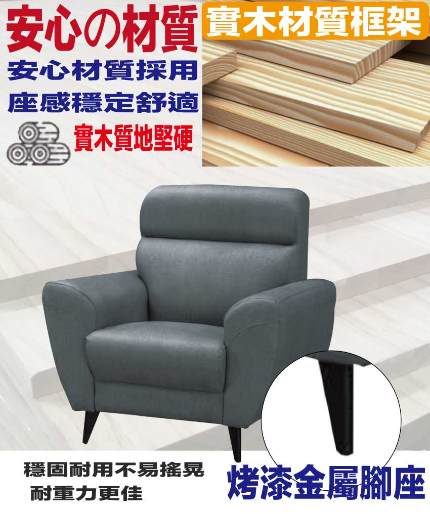 採用內部實木框架+烤漆金屬腳座+耐磨耐刮皮革+高回彈泡棉等安心材質製造