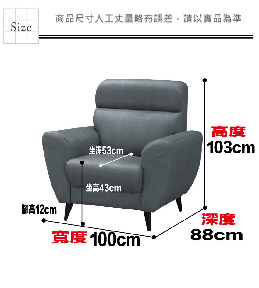 - 1人沙發椅尺寸:(寬)100x(深)88x(高)103/公分