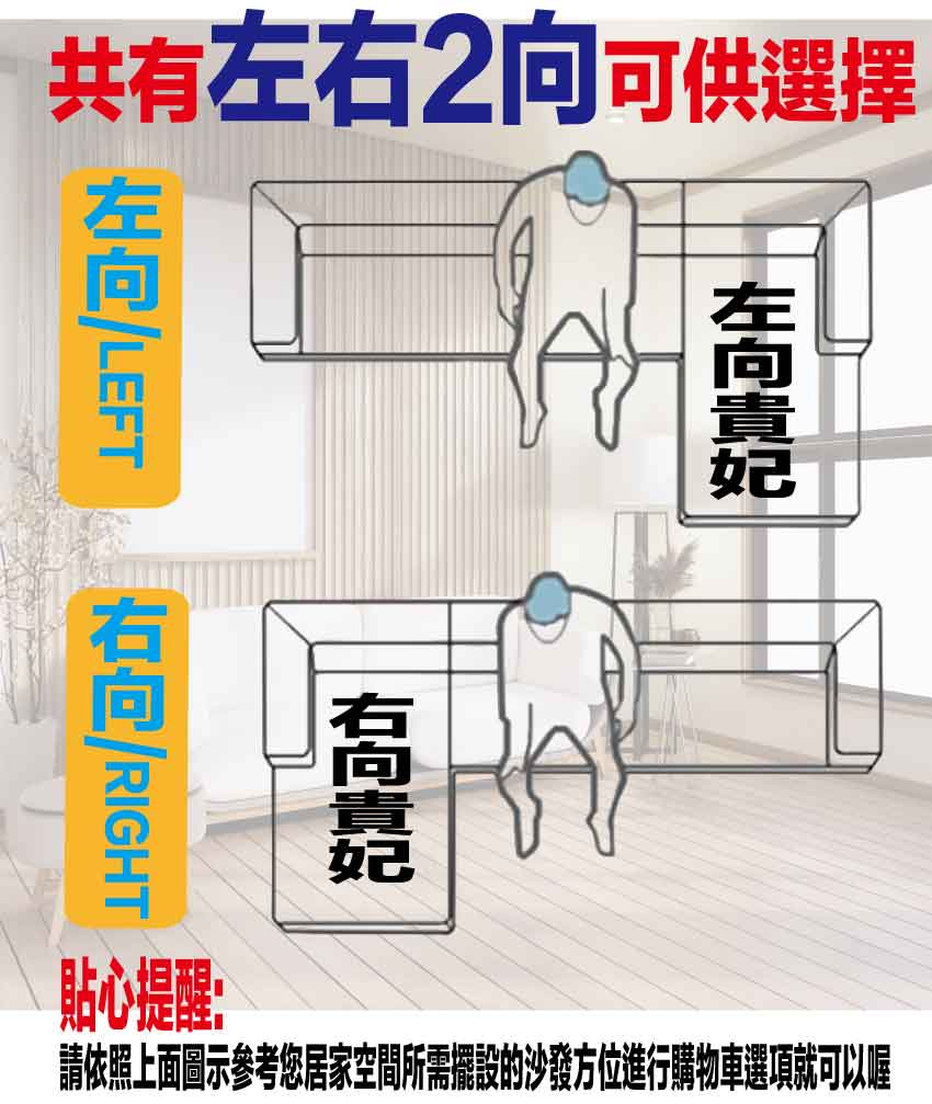 沙發設有左向貴妃&右向貴妃二向可選的擺設設置,您可依據您實際的居家空間選擇所需的沙發選項擺設