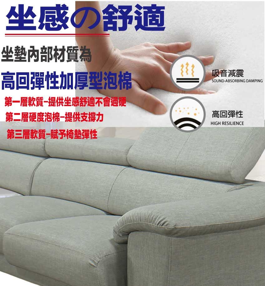 此組L型沙發椅另有頭枕可調整&坐墊可前後滑移的功能性設計,讓您可更舒適的躺臥