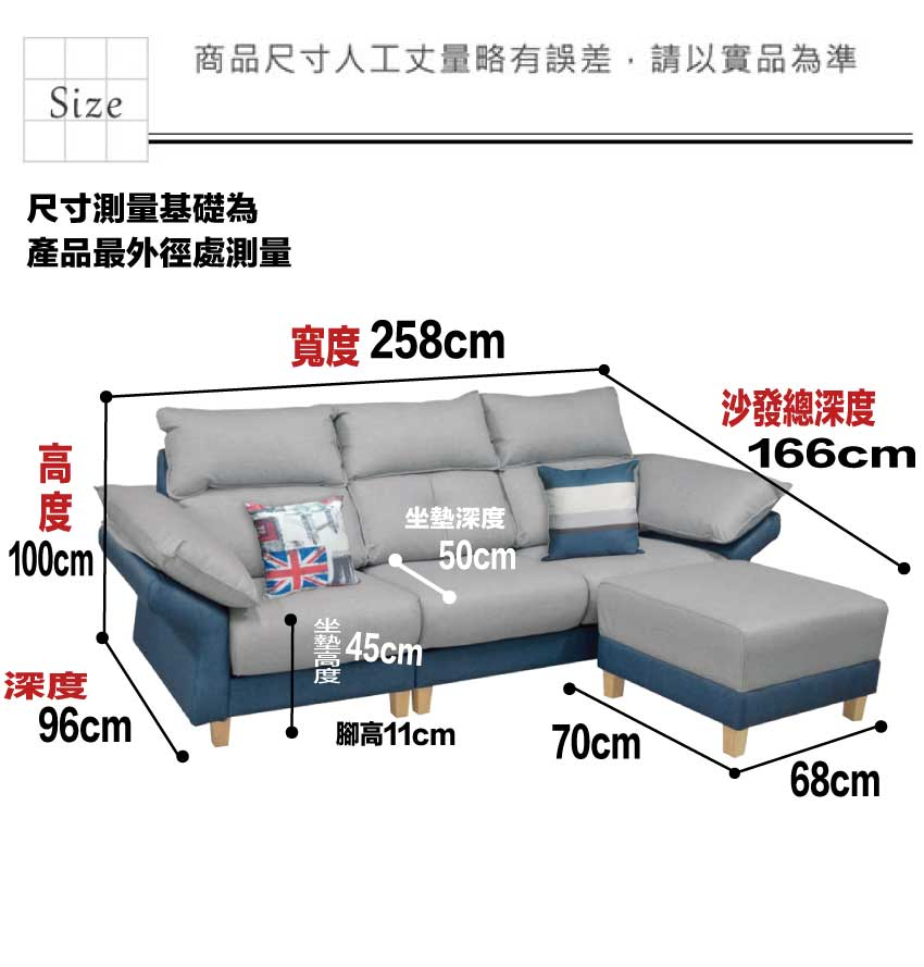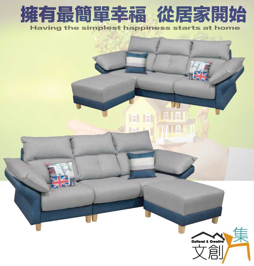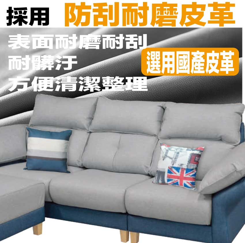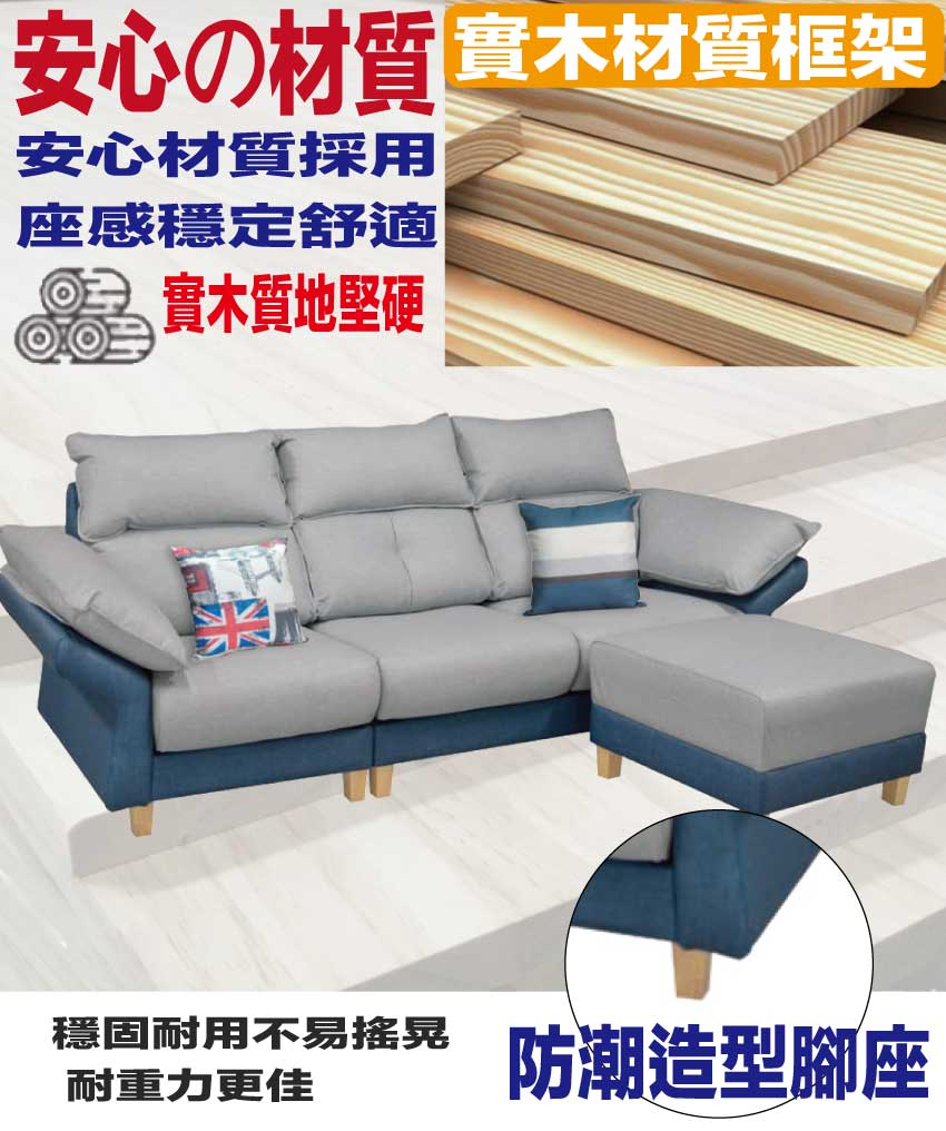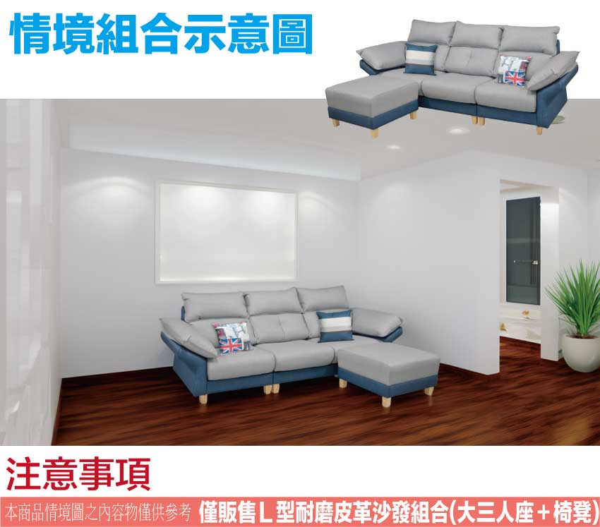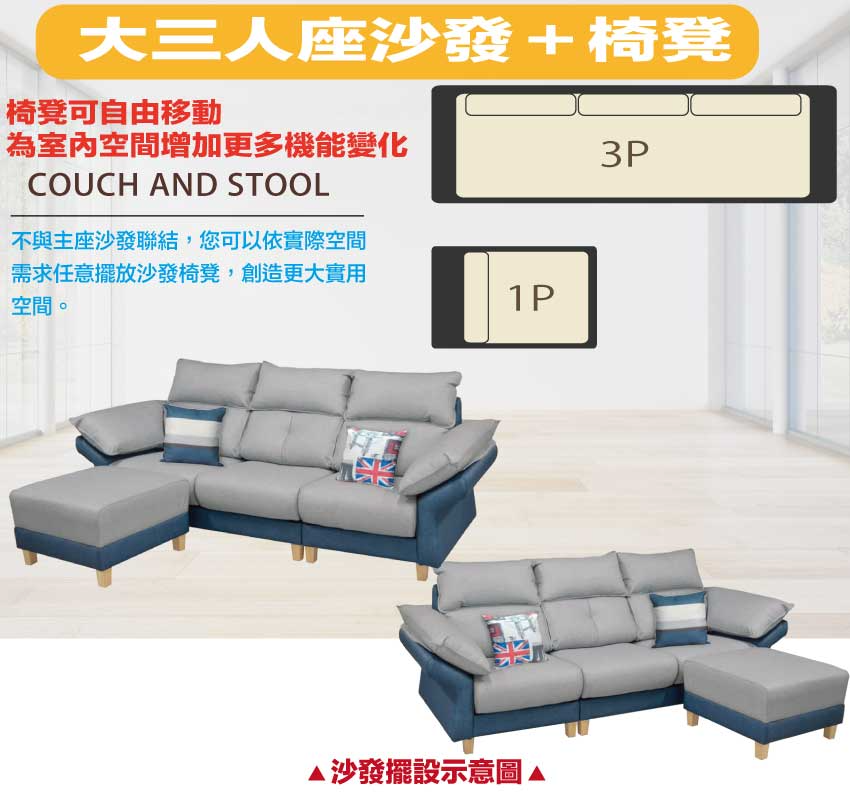 此組L型沙發椅為大三人座+椅凳組合,椅凳可視使用需求自由擺放增加居家空間變化便利性
