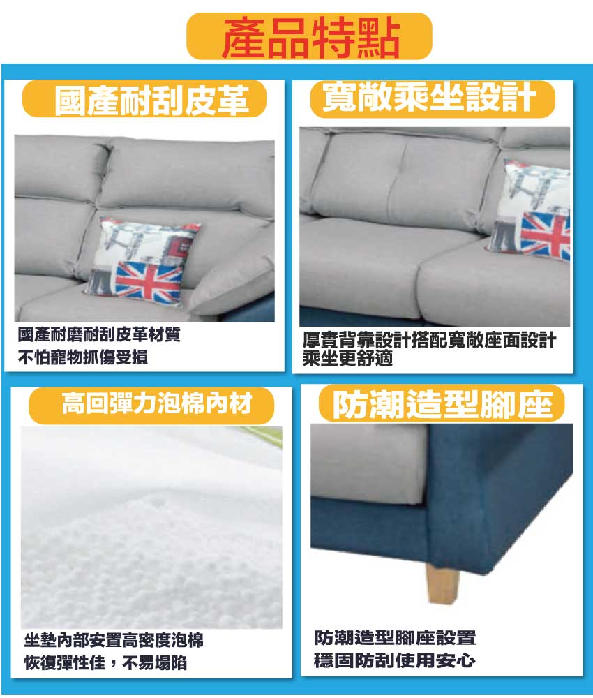 採用內部實木板材框架+防潮造型腳座+耐刮耐磨皮革+高回彈力加厚泡棉等安心材質製造