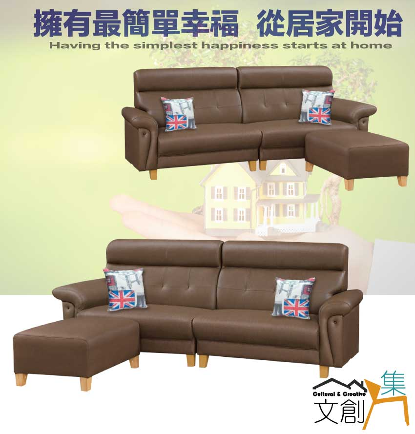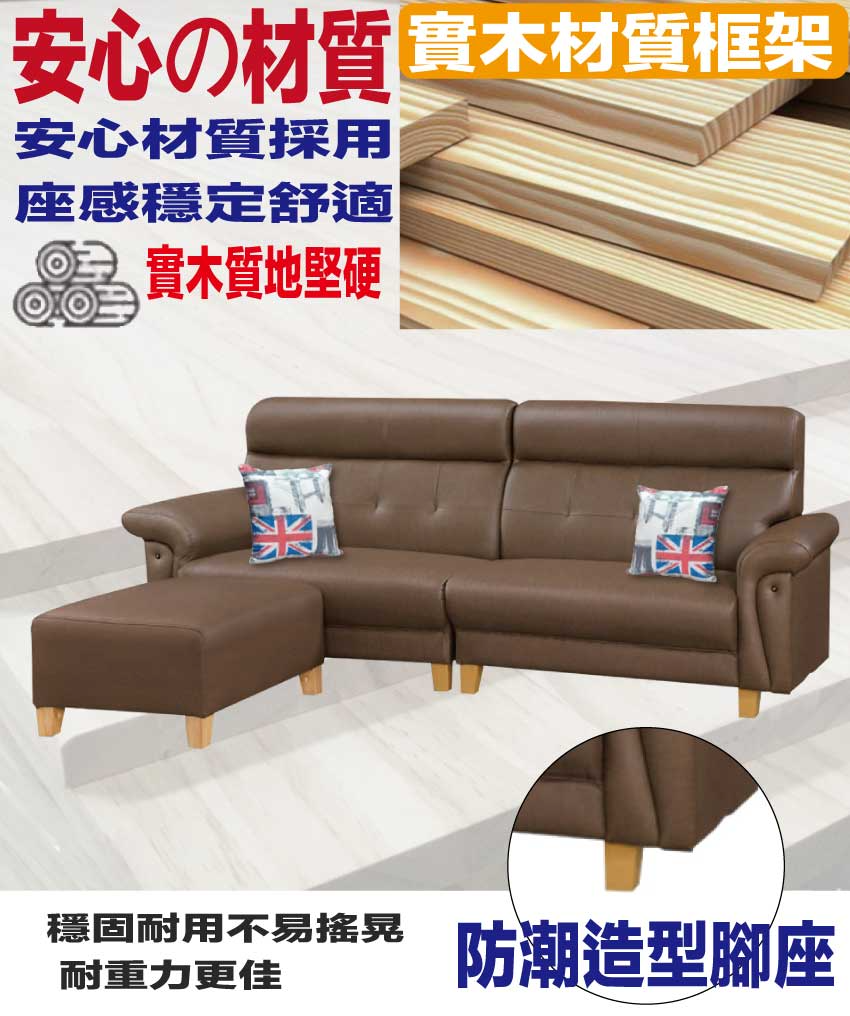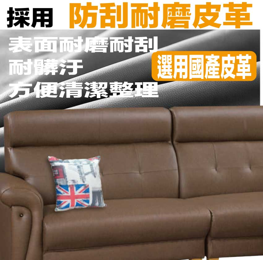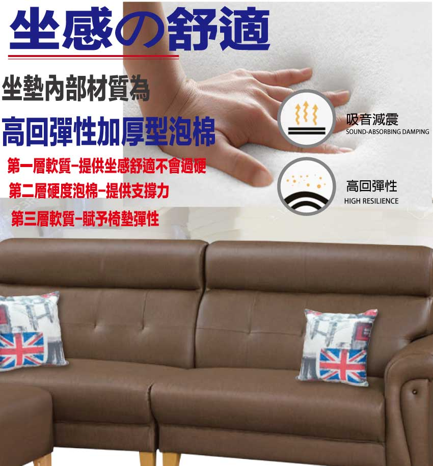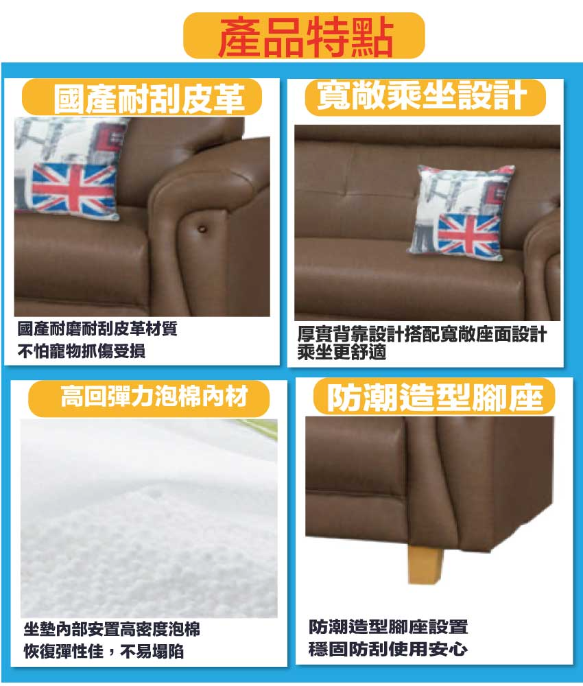 採用內部實木板材框架+防潮造型腳座+耐刮耐磨皮革+高回彈力加厚泡棉等安心材質製造