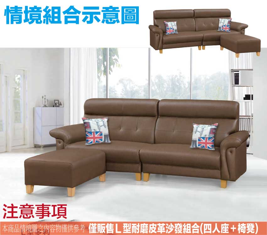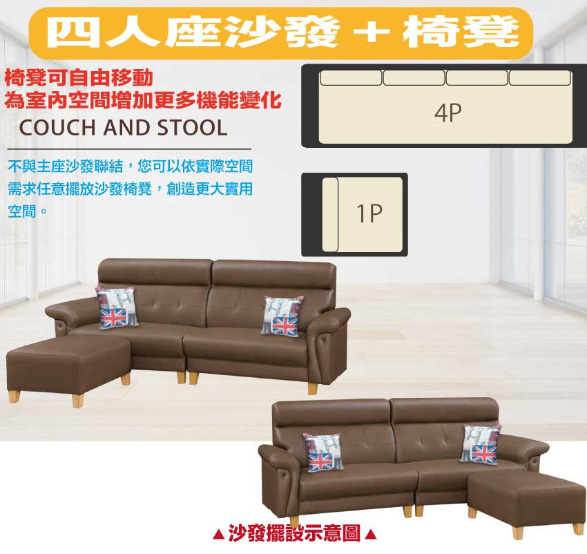 此組L型沙發椅為四人座+椅凳組合,椅凳可視使用需求自由擺放增加居家空間變化便利性