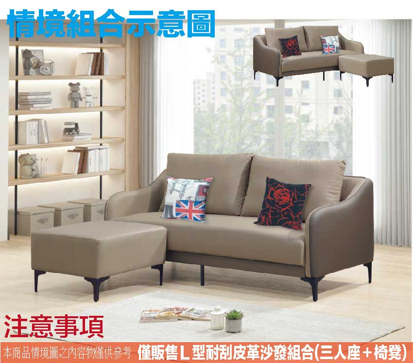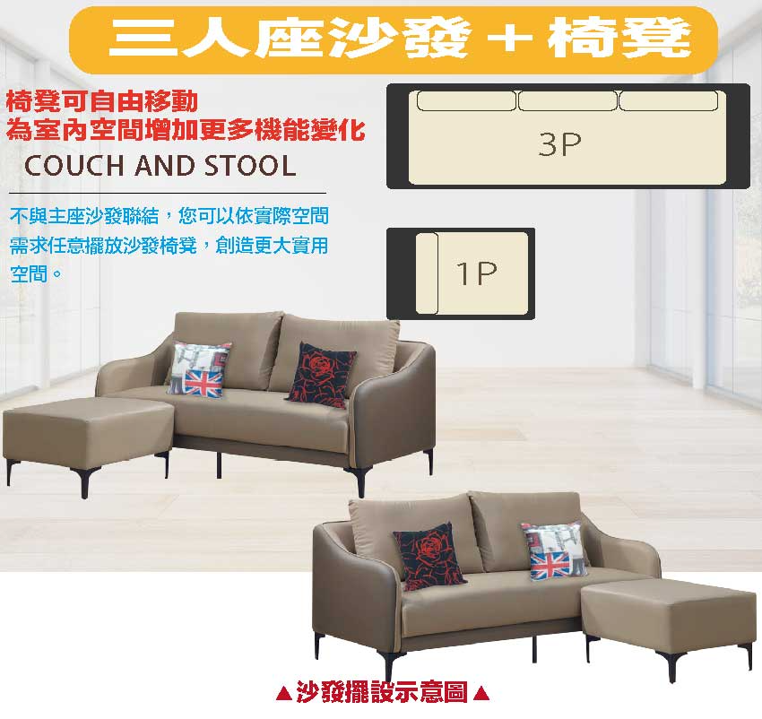 此組L型沙發椅為三人座+椅凳組合,椅凳可視使用需求自由擺放增加居家空間變化便利性