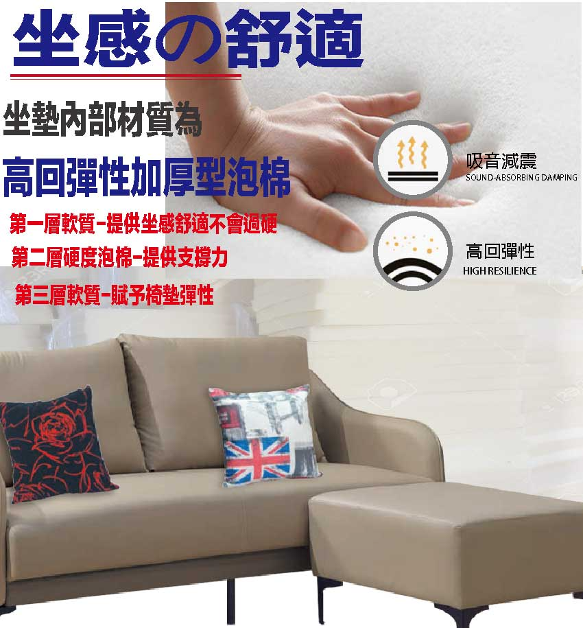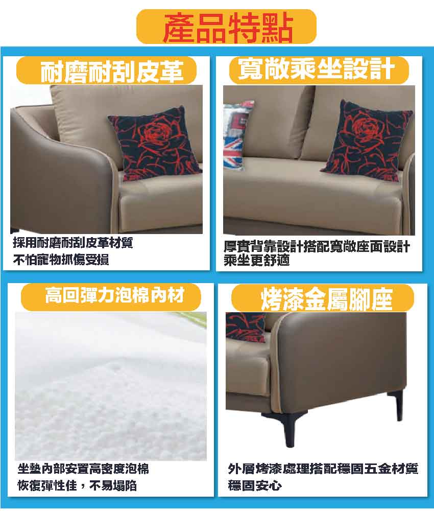 採用內部實木板材框架+烤漆金屬腳座+耐刮耐磨皮革+高回彈力加厚泡棉等安心材質製造