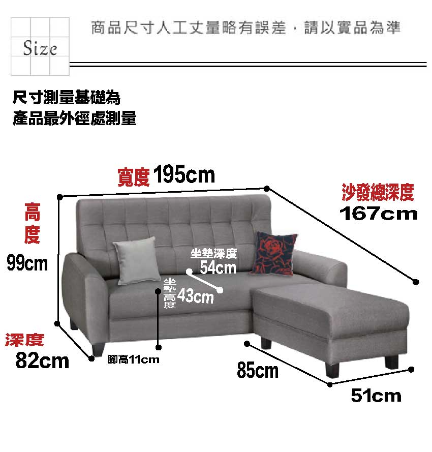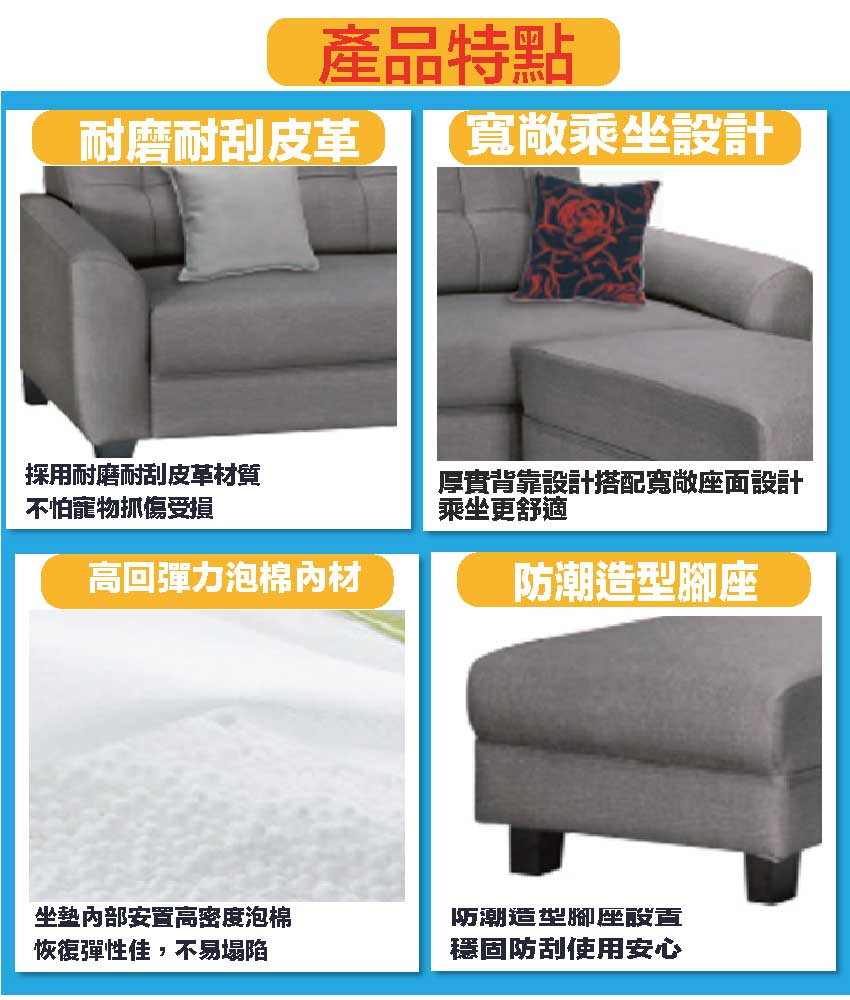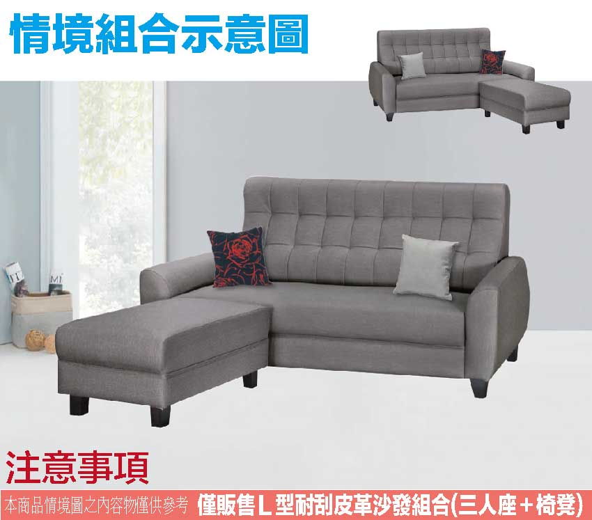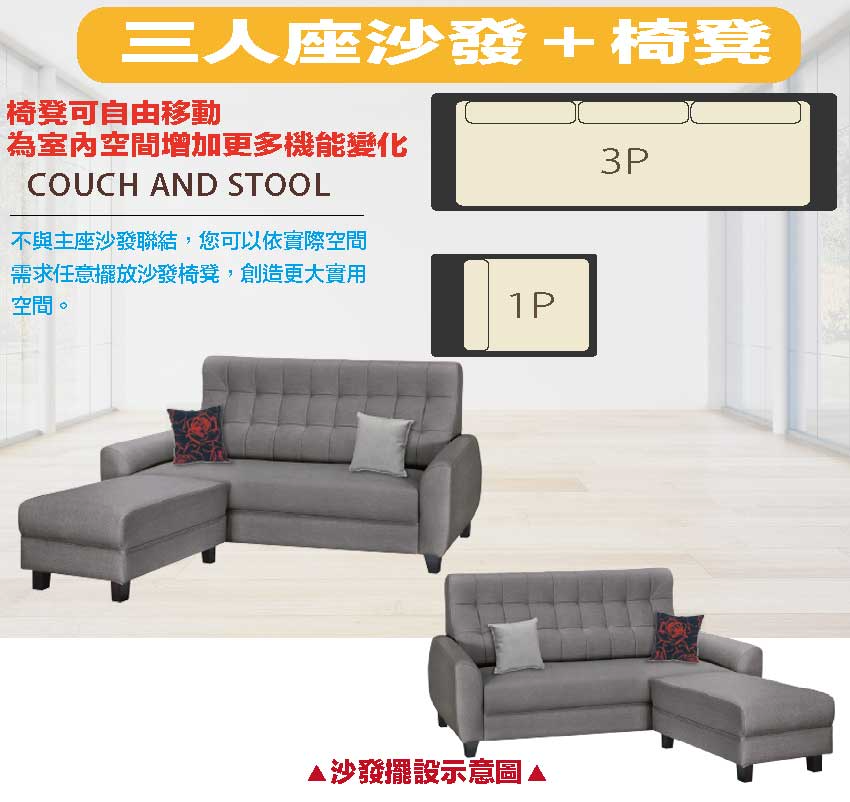 此組L型沙發椅為三人座+椅凳組合,椅凳可視使用需求自由擺放增加居家空間變化便利性