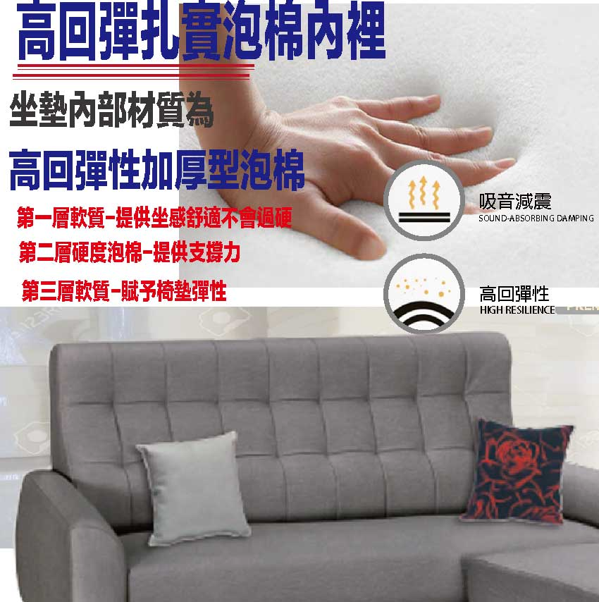 採用內部實木板材框架+防潮造型腳座+耐刮耐磨皮革+高回彈力加厚泡棉+獨立筒彈簧座包等安心材質製造