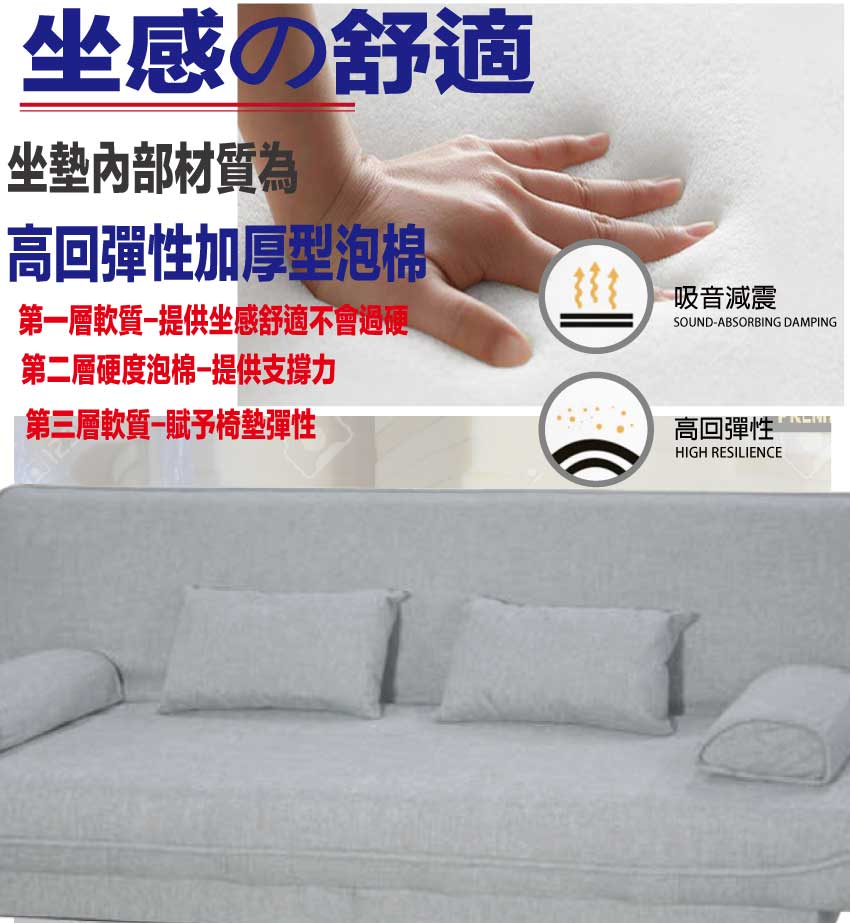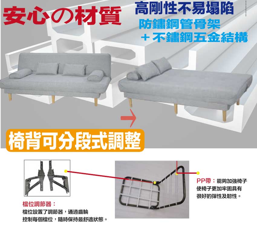 採用防鏽鋼管結構&不鏽鋼五金結構+防潮造型腳座+高回彈力加厚泡棉+透氣亞麻布等安心材質