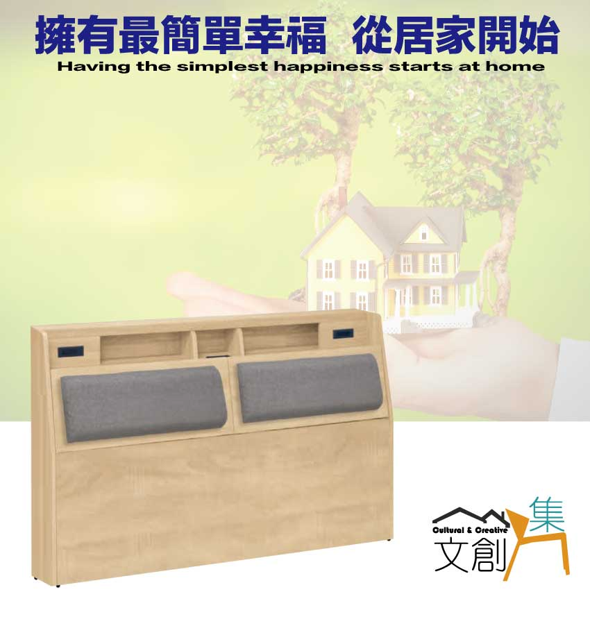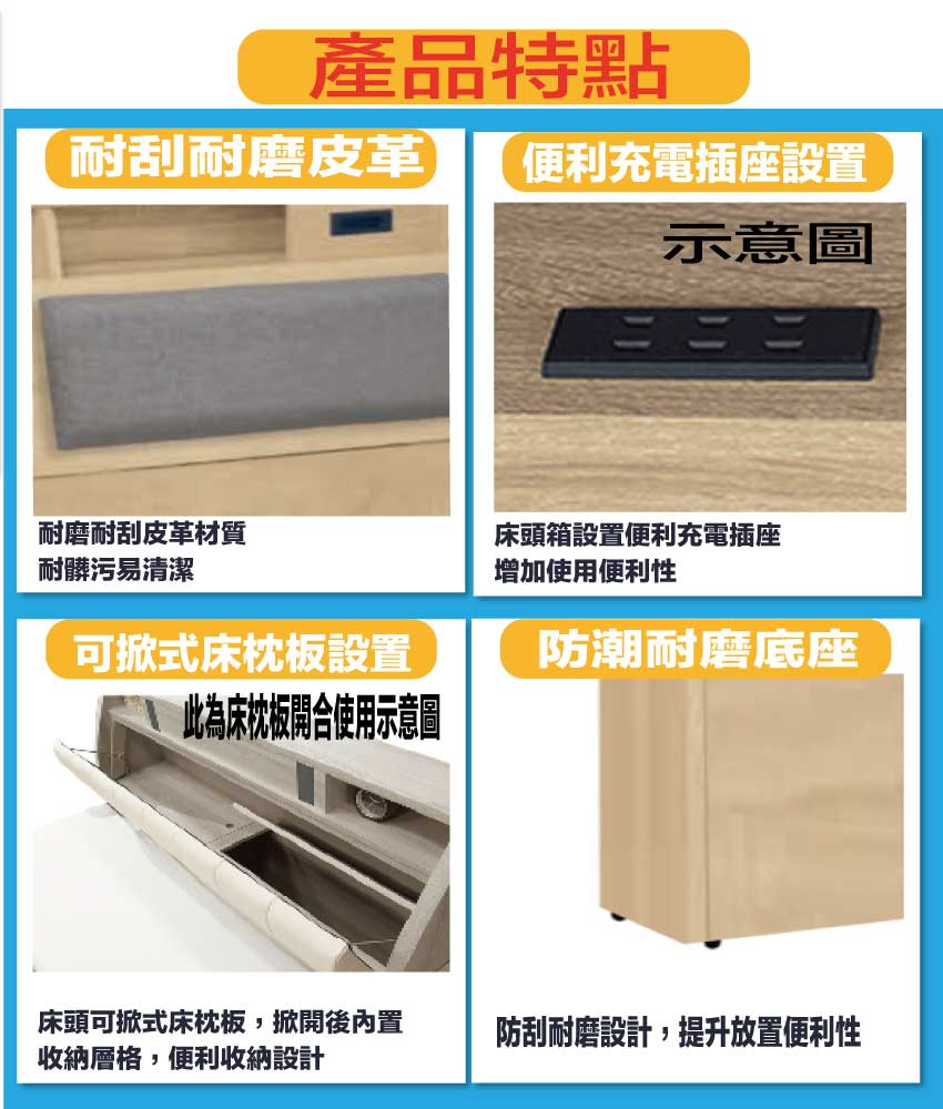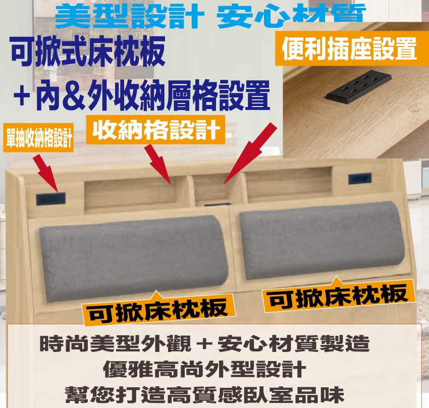 搭配床頭採用可掀式床枕板+內&外收納空間+便利插座等收納空間設計