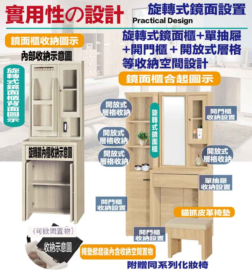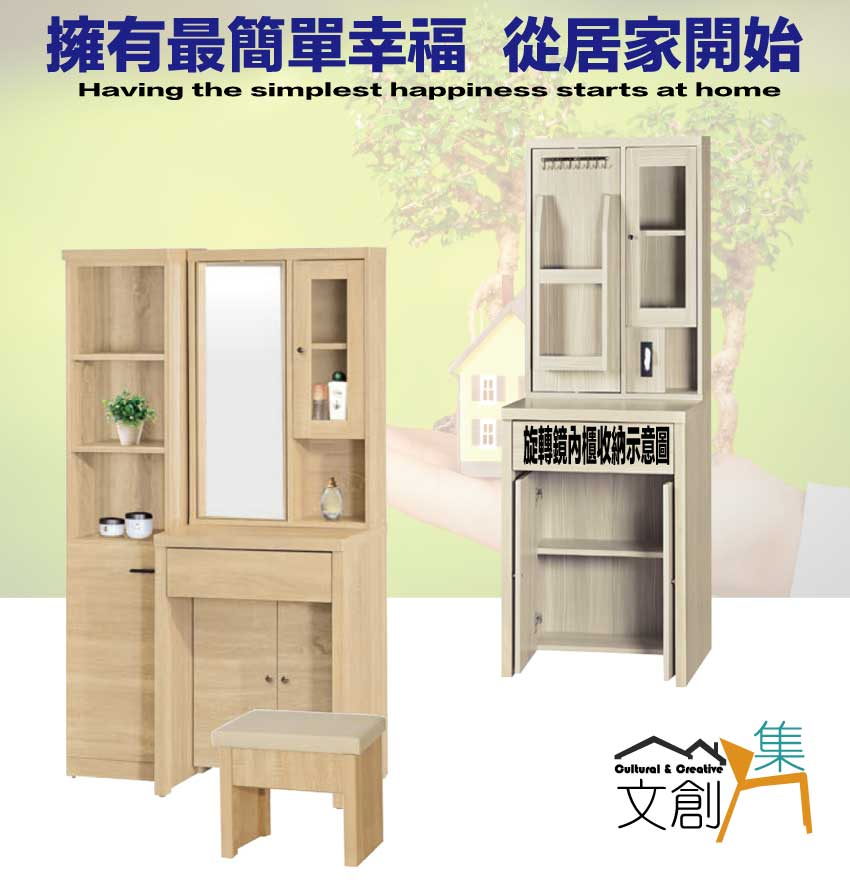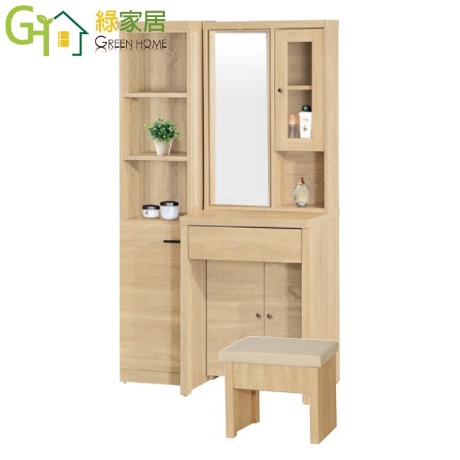 【綠家居】米倫3.2尺旋轉鏡面鏡台組合(含化妝椅) 原橡木紋色系+安心材質製造,使用放心+搭配居家更便利,採用防蛀木心板+防潮耐磨底座+強化玻璃鏡面等安心材質製造 ,外層採用防潮耐磨噴漆處理搭配採用旋轉鏡面櫃+開門櫃+單抽屜+內&外開放層格等收納空間設計,全由專人配送到家,專業安心服務,替你省下更多時間!