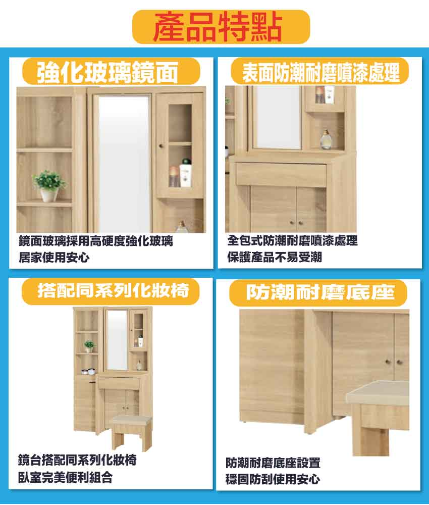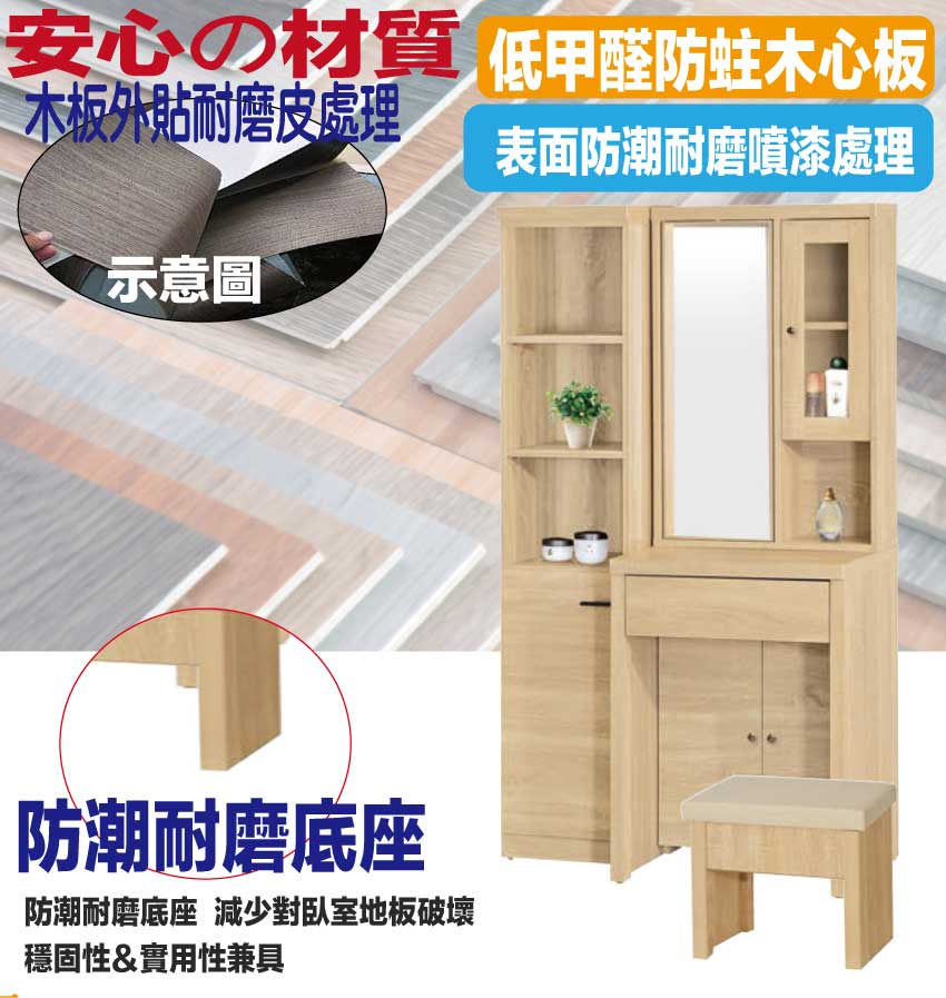 採用防蛀木心板+防潮耐磨底座+強化玻璃鏡面等安心材質製造