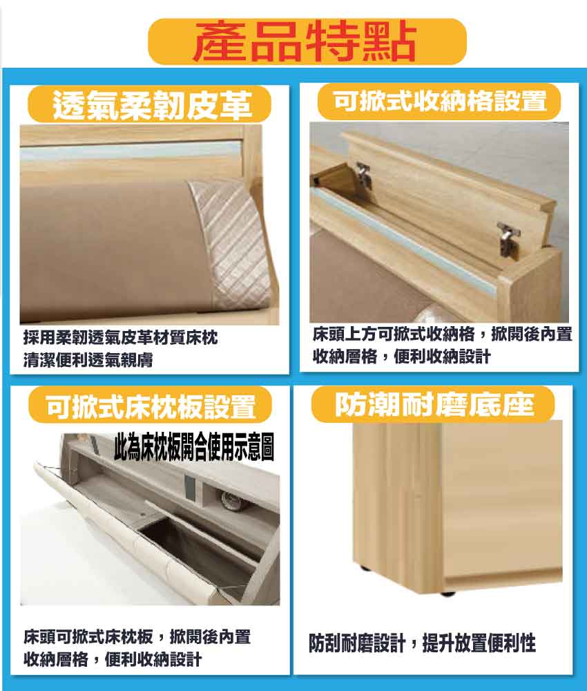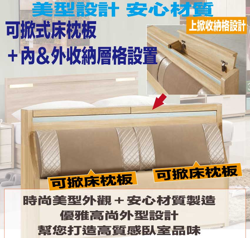 搭配床頭採用可掀式床枕板+內&外收納空間+上層可掀收納層格等收納空間設計