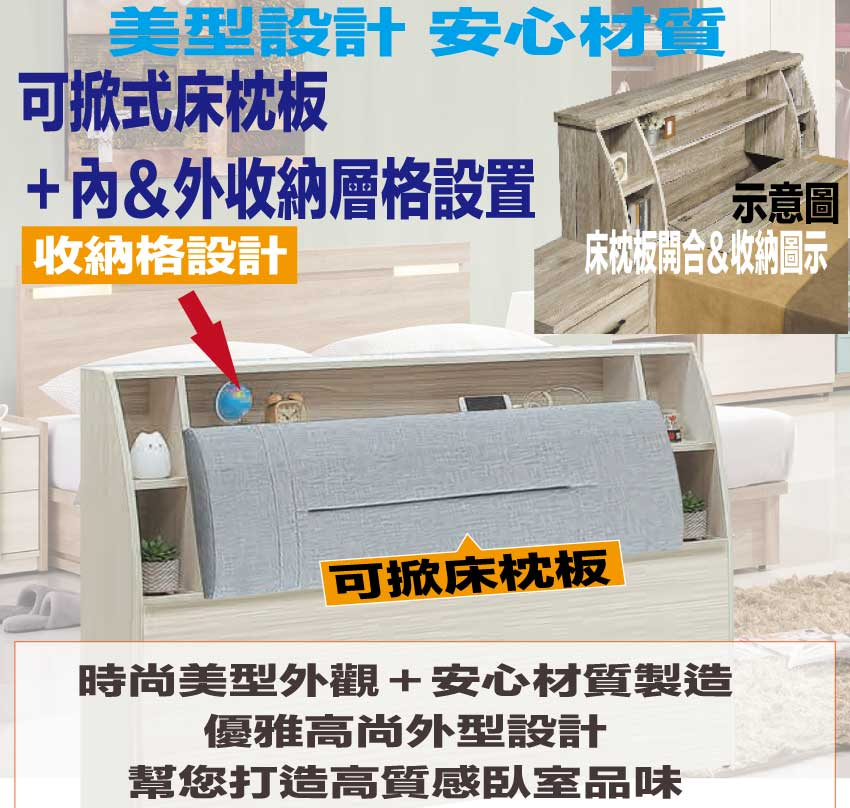搭配床頭採用可掀式床枕板+內&外收納空間等收納空間設計