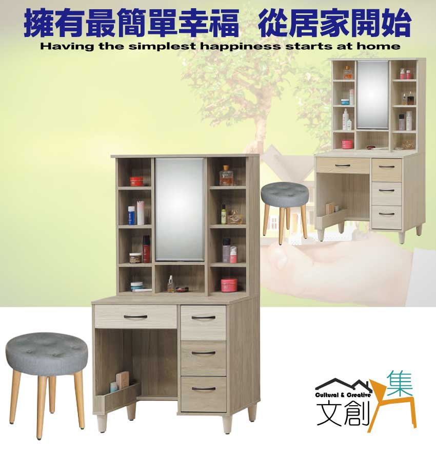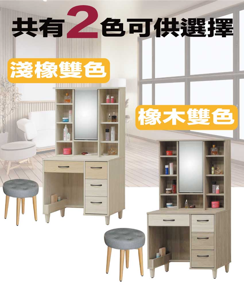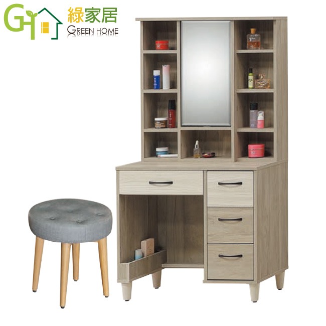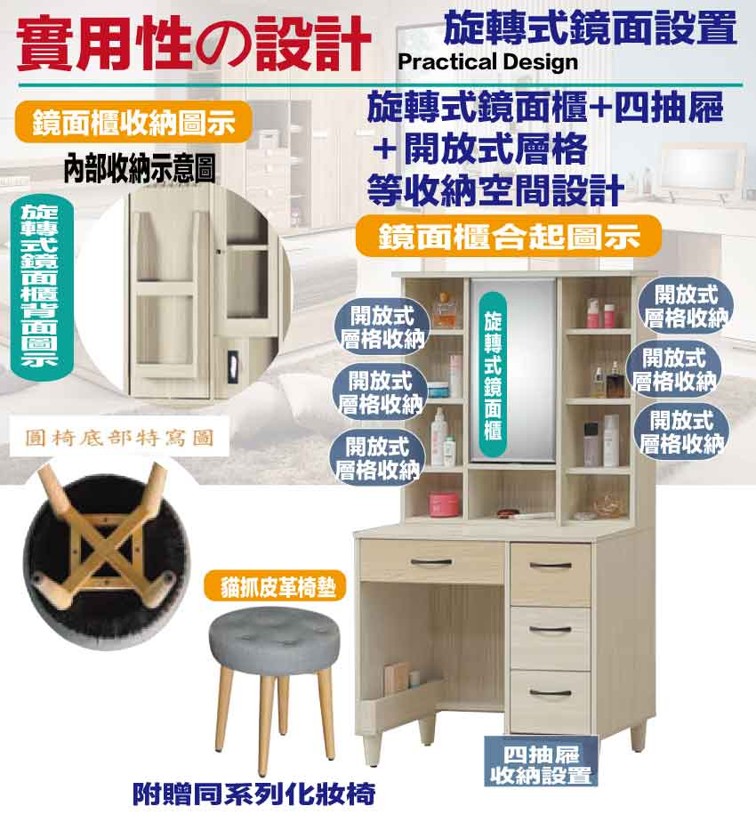 【綠家居】米賽倫2.7尺旋轉鏡面鏡台組合(二色可選+含化妝椅) 二色可選+安心材質製造,使用放心+搭配居家更便利,採用防蛀木心板+防潮實木腳座+強化玻璃鏡面等安心材質製造 ,外層採用防潮耐磨噴漆處理搭配採用旋轉鏡面櫃+四抽屜+內&外開放層格等收納空間設計,全由專人配送到家,專業安心服務,替你省下更多時間!