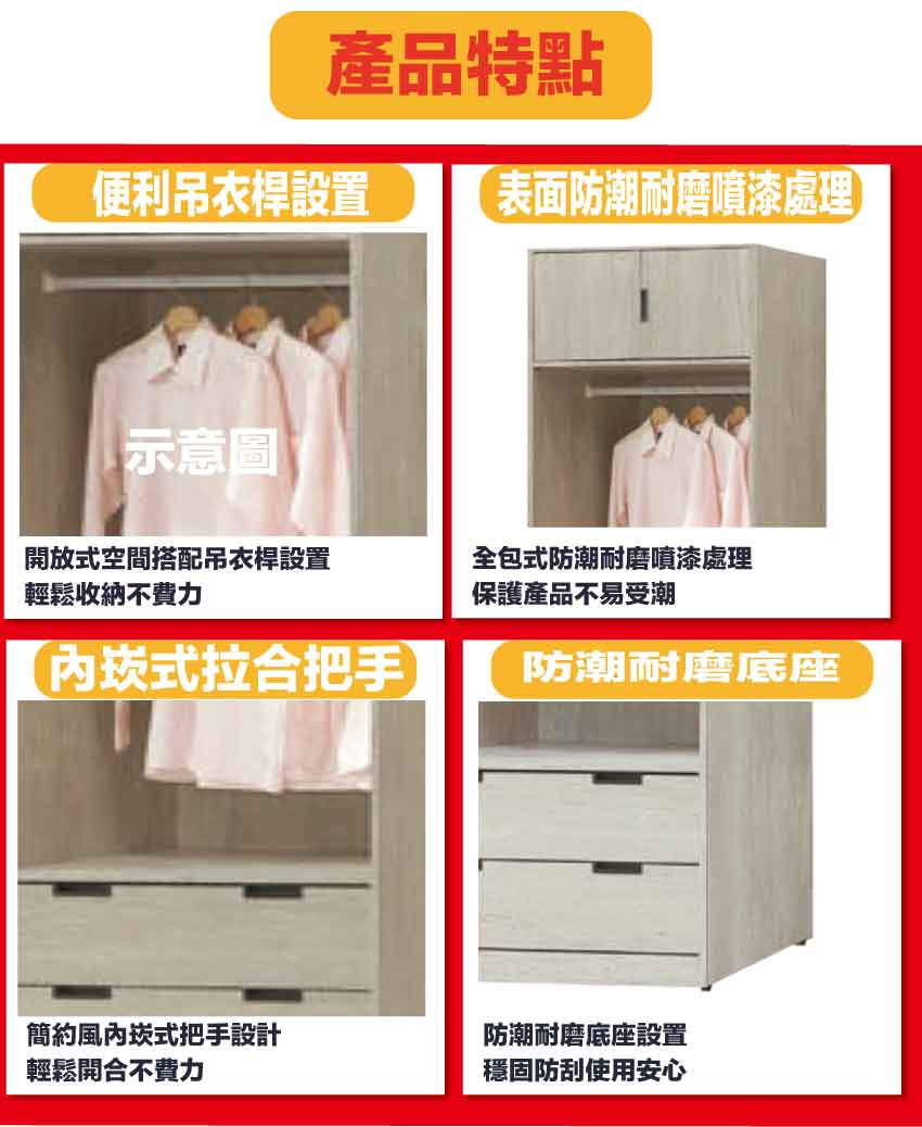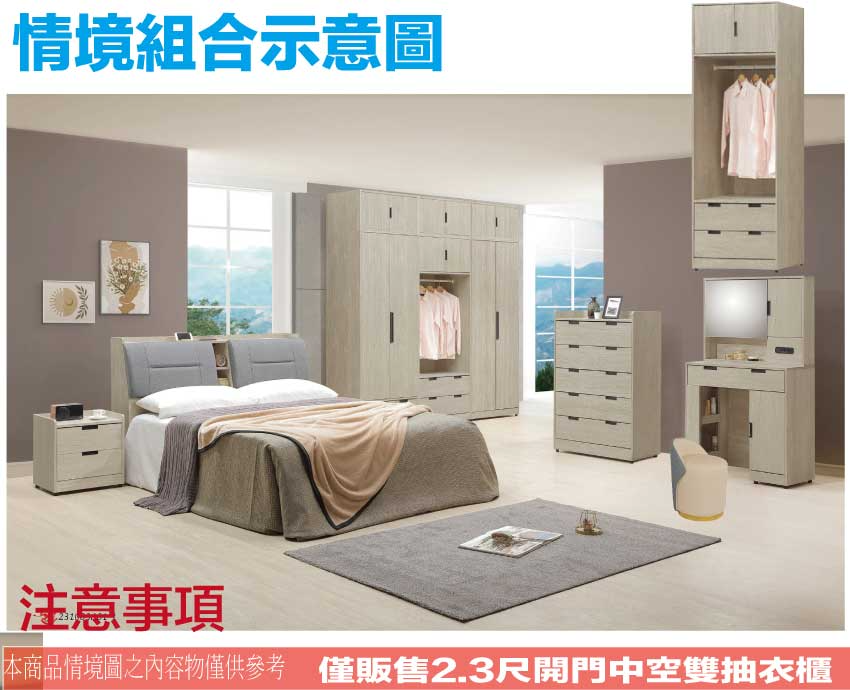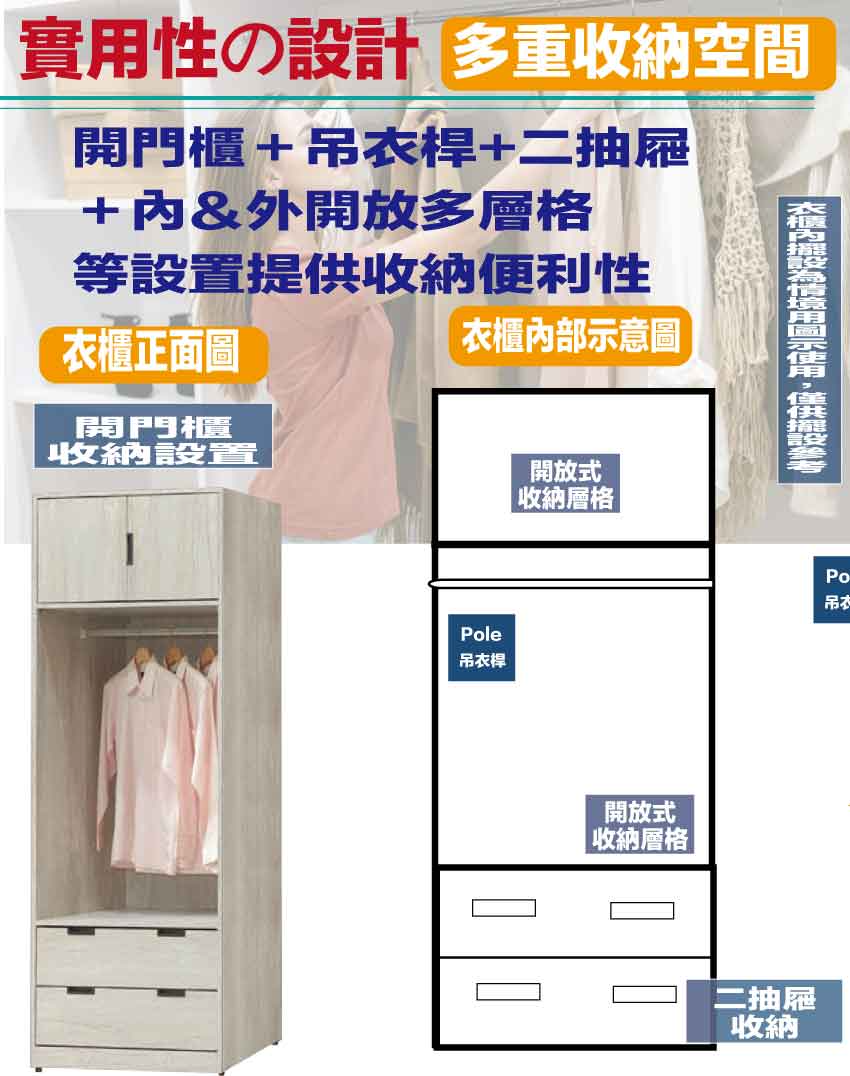 搭配採用開門櫃+吊衣桿+二抽屜+開放層格等收納空間設計