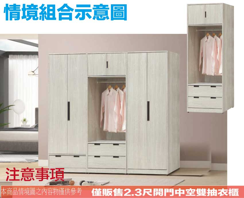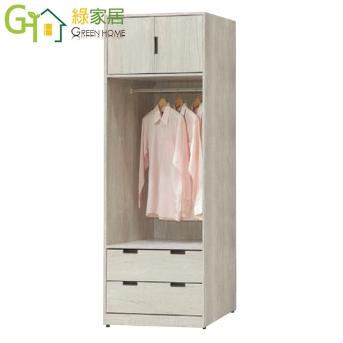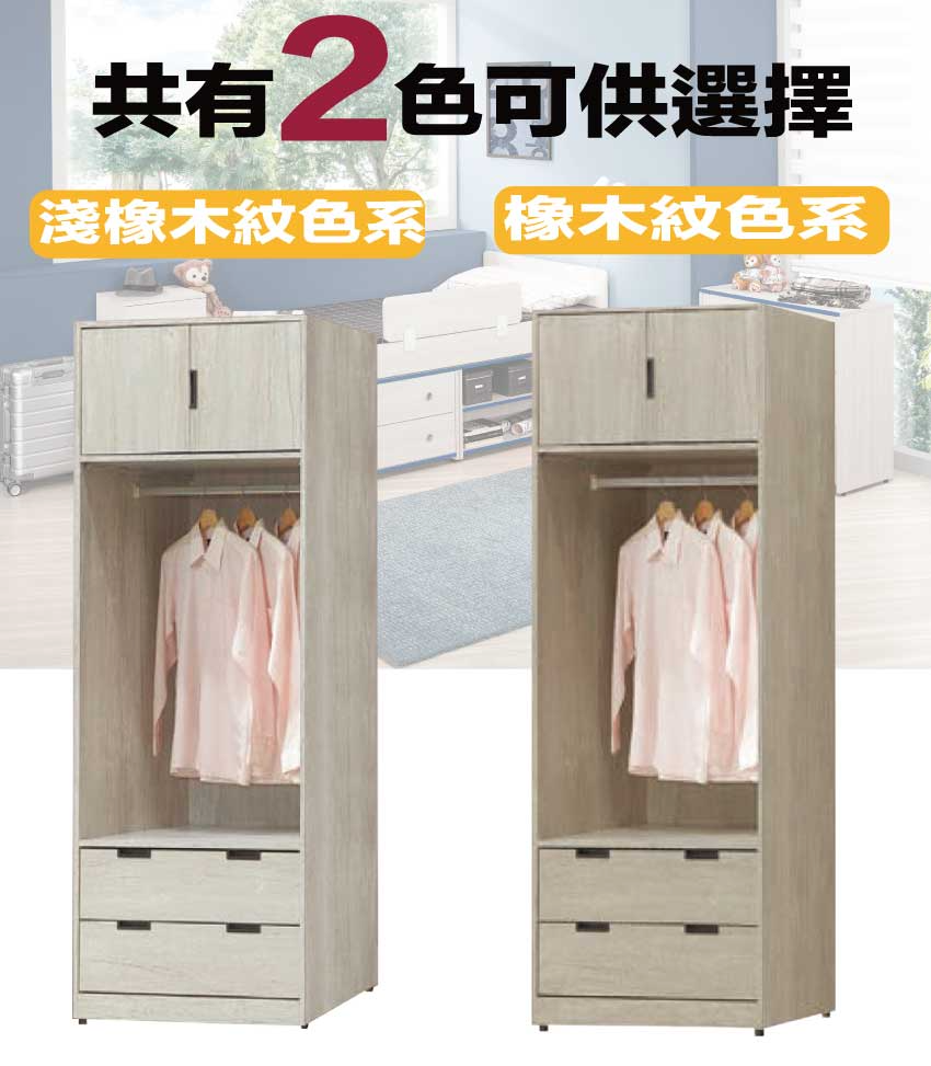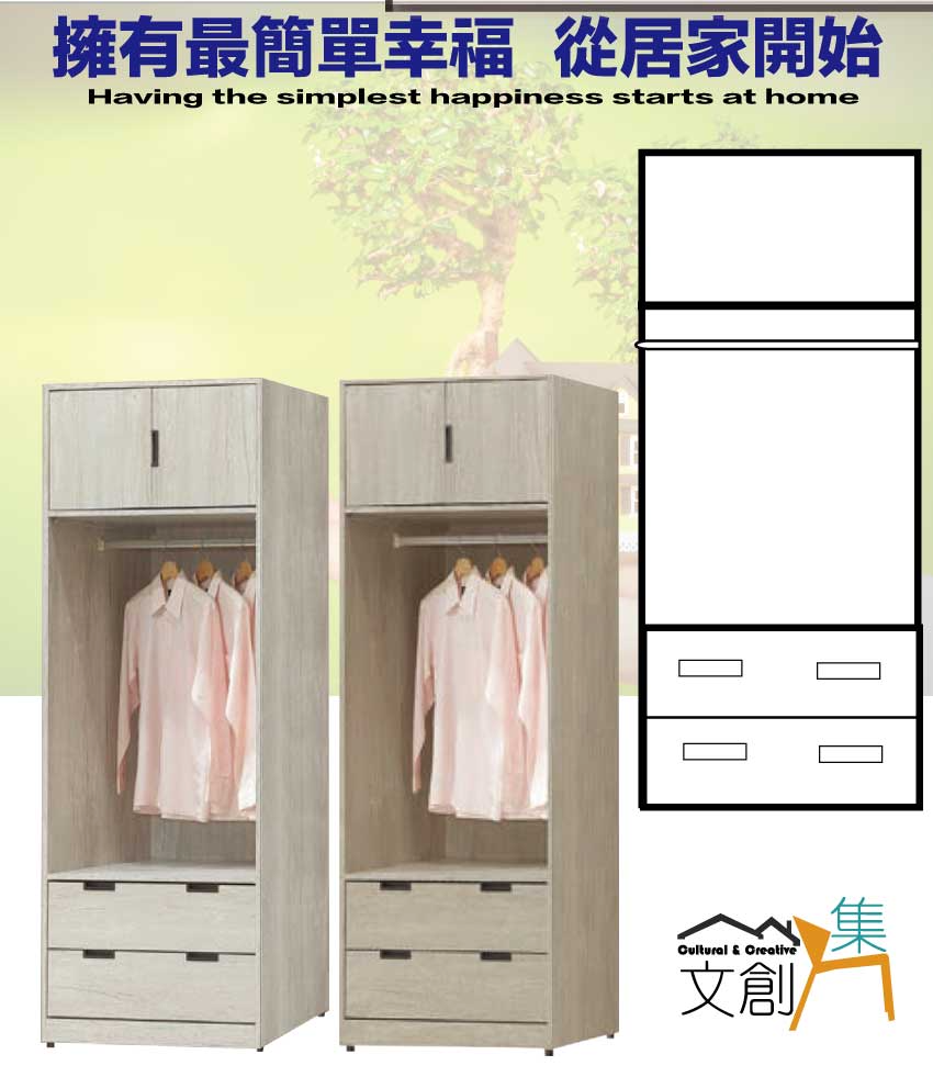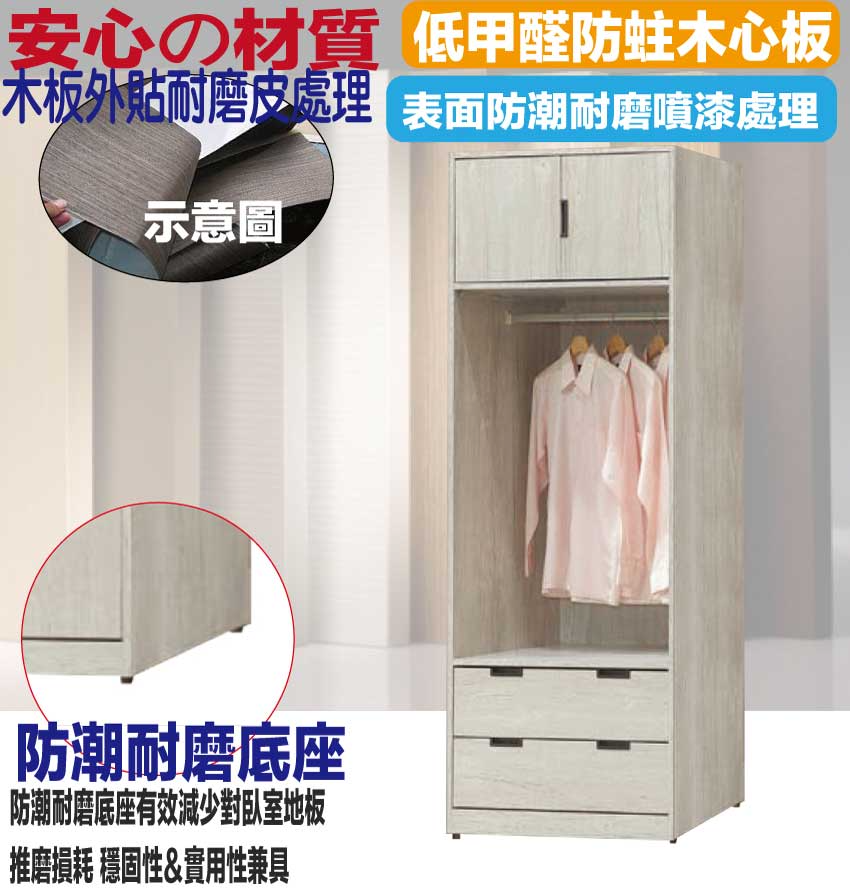 【綠家居】賽斯2.3尺二門二抽中空衣櫃(二色可選) 二色可選+安心材質製造,使用放心+搭配居家更便利,採用防蛀木心板+防潮耐磨底座+五金滑軌結構等安心材質製造 ,外層採用防潮耐磨噴漆處理搭配採用開門櫃+吊衣桿+二抽屜+開放層格等收納空間設計,全由專人配送到家,專業安心服務,替你省下更多時間!