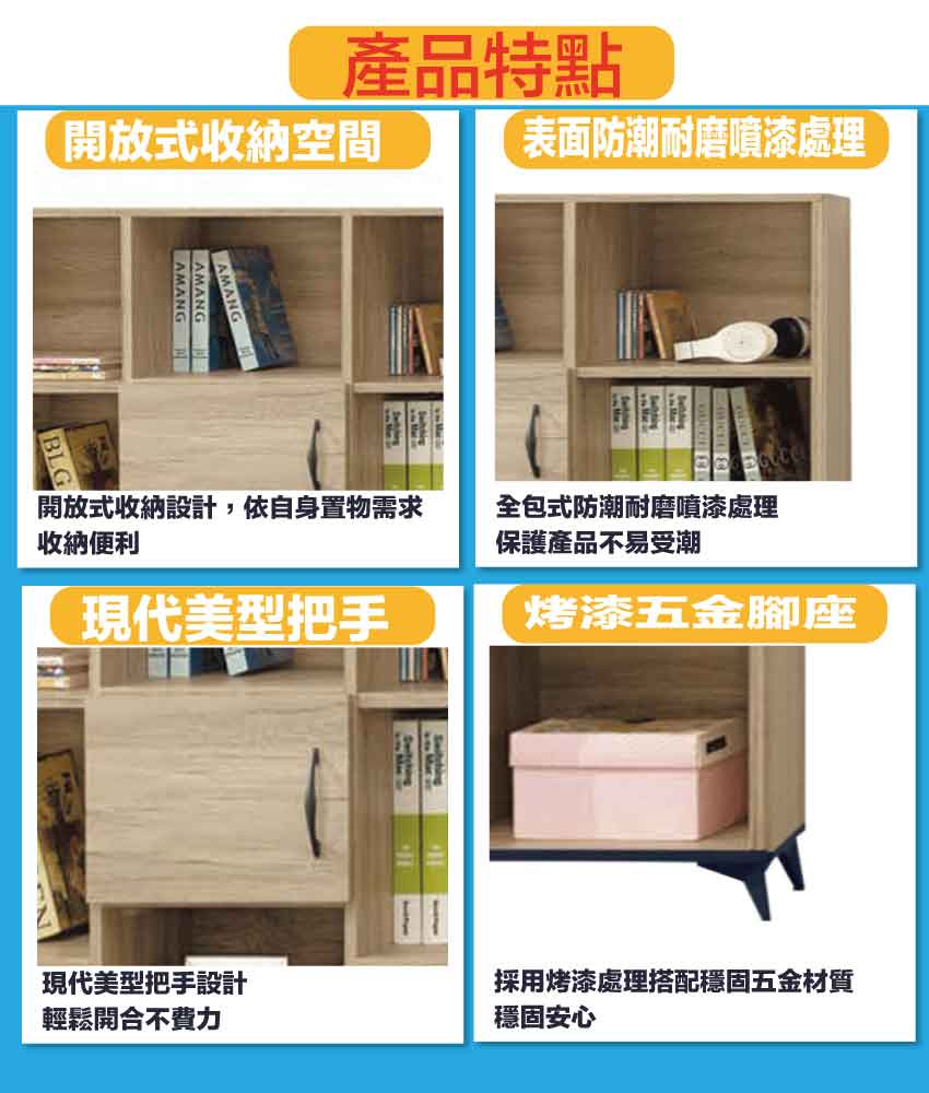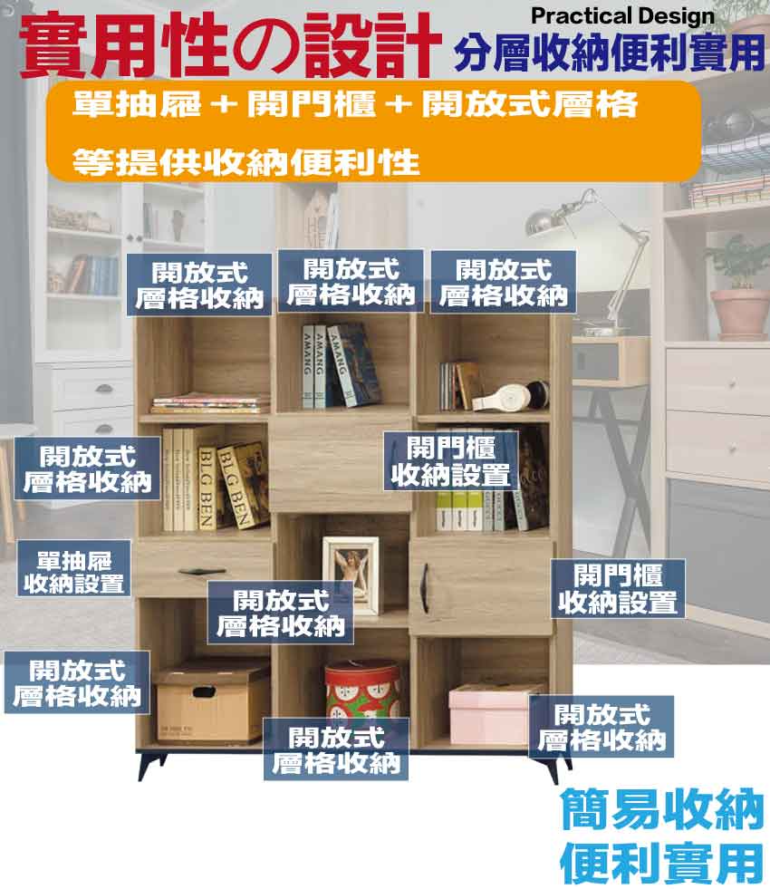 搭配採用開門櫃+單抽屜+開放層格等收納空間設計