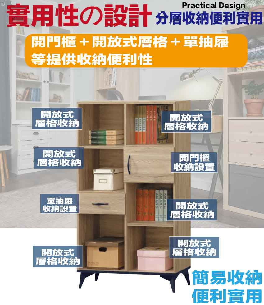 搭配採用開門櫃+單抽屜+開放層格等收納空間設計