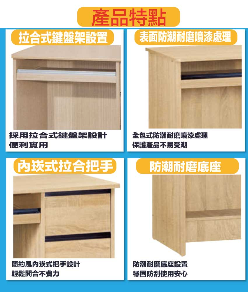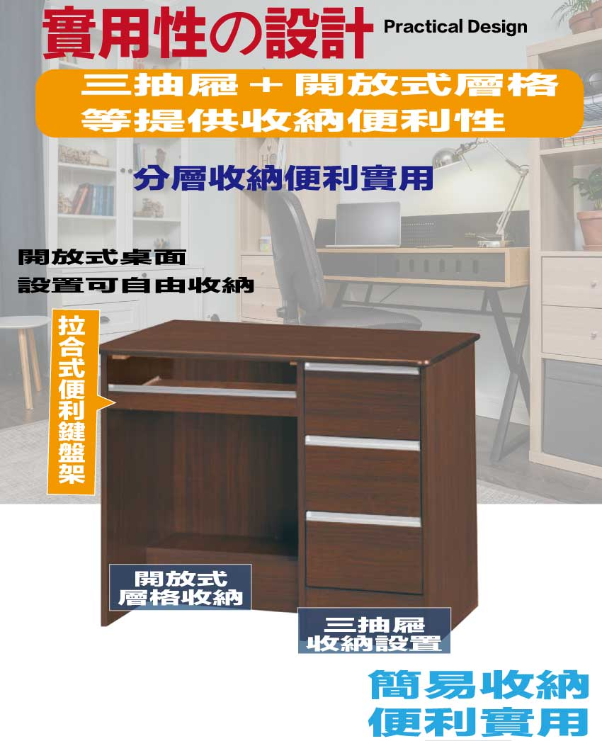 搭配採用拉合鍵盤架+三抽屜+開放桌面等收納空間設計