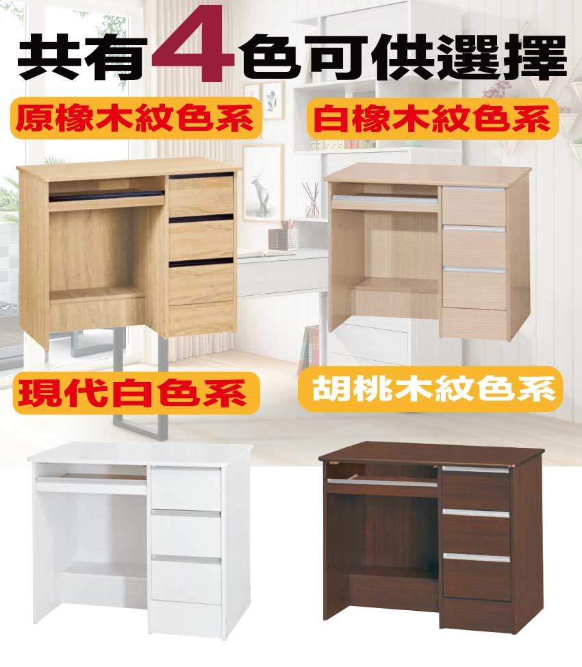 【綠家居】吉富3尺鍵盤三抽書桌(四色可選) 四色可選+安心材質製造,使用放心+搭配居家更便利,採用防蛀木心板+防潮耐磨底座+五金滑軌結構等安心材質製造 ,外層採用防潮耐磨噴漆處理搭配採用拉合鍵盤架+三抽屜+開放桌面等收納空間設計,全由專人配送到家,專業安心服務,替你省下更多時間!