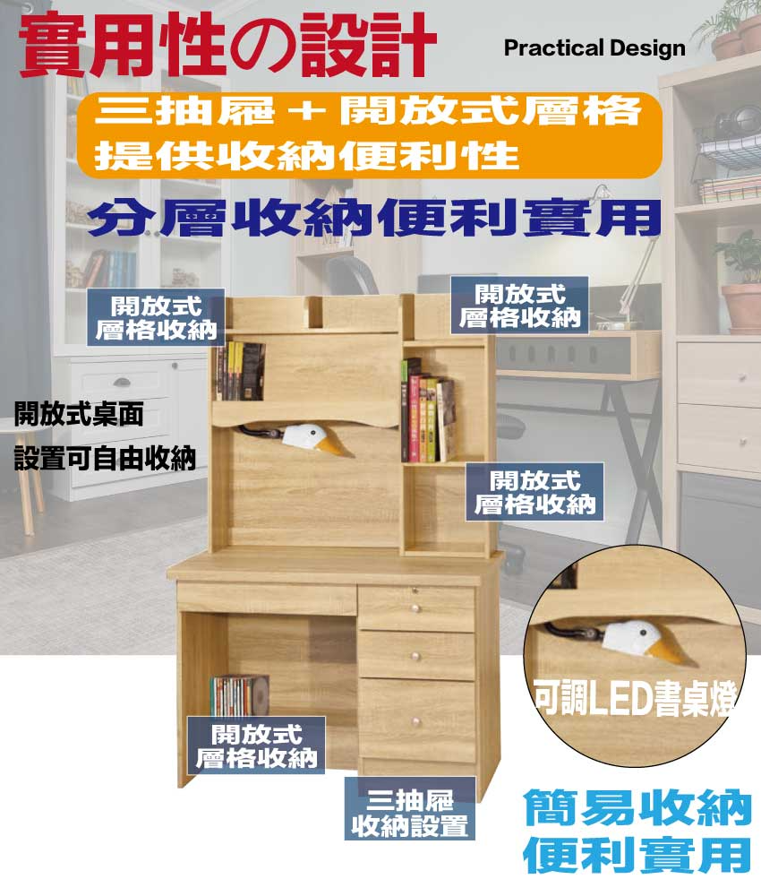 搭配採用可調LED燈架+四抽屜+開放層格等收納空間設計