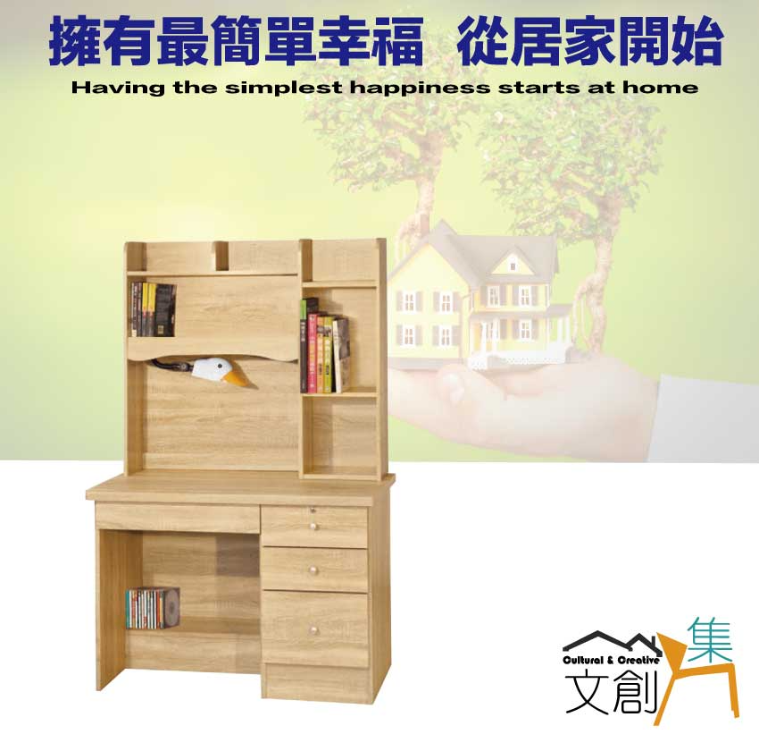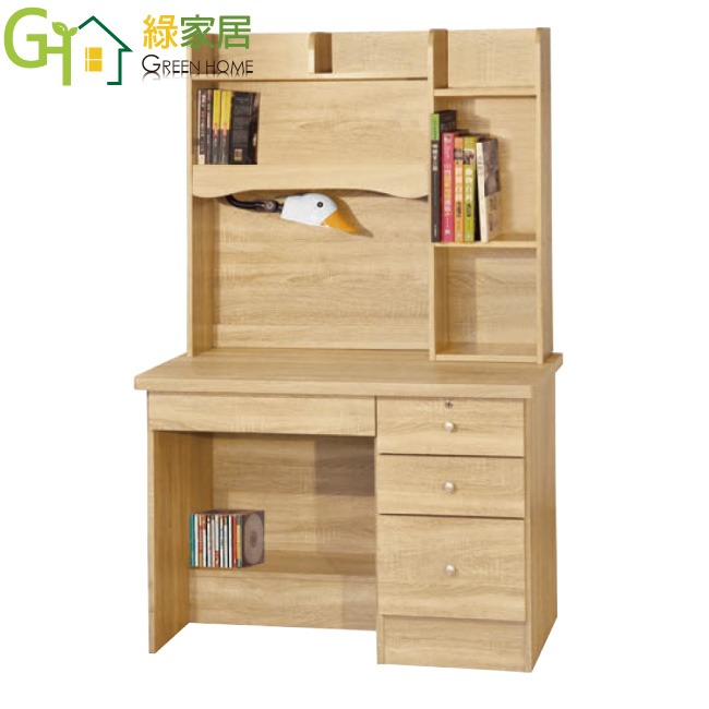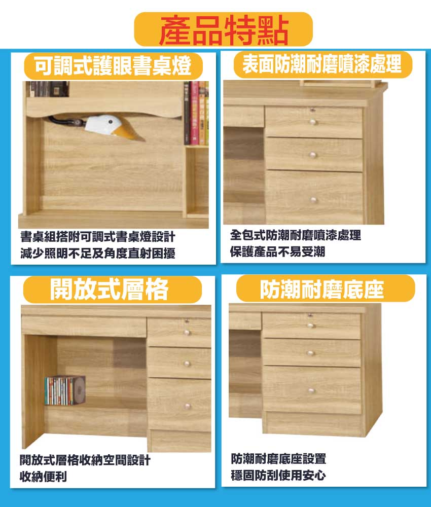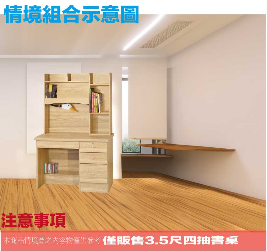【綠家居】喜鵲3.5尺四抽書桌組合(附可調護眼燈) 橡木紋色系+安心材質製造,使用放心+搭配居家更便利,採用防蛀木心板+防潮耐磨底座+五金滑軌結構等安心材質製造 ,外層採用防潮耐磨噴漆處理搭配採用可調LED燈架+四抽屜+開放層格等收納空間設計,全由專人配送到家,專業安心服務,替你省下更多時間!