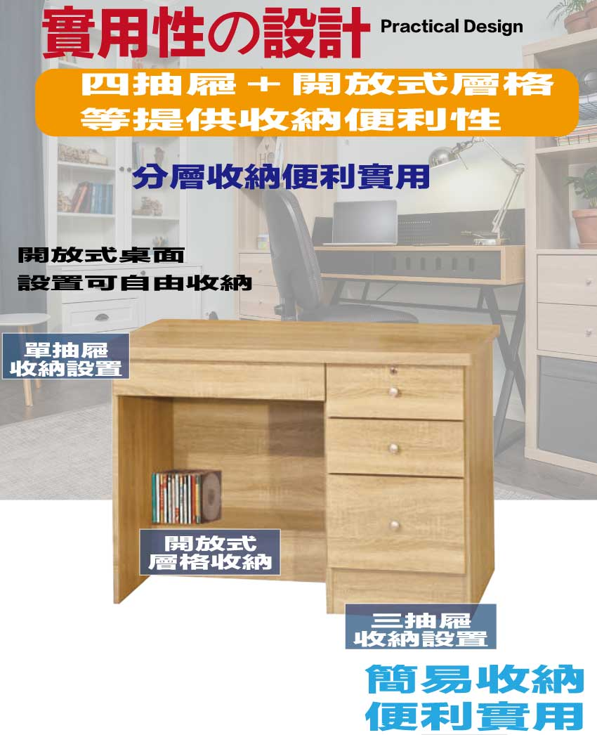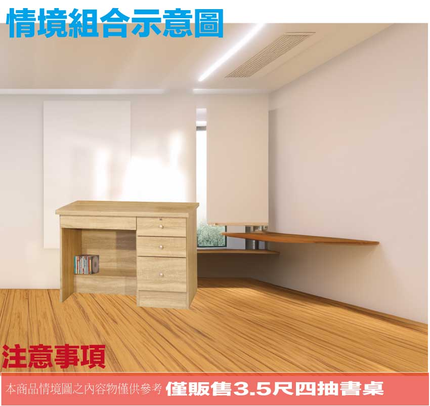 【綠家居】喜鵲3.5尺四抽書桌 橡木紋色系+安心材質製造,使用放心+搭配居家更便利,採用防蛀木心板+防潮耐磨底座+五金滑軌結構等安心材質製造 ,外層採用防潮耐磨噴漆處理搭配採用四抽屜+開放層格等收納空間設計,全由專人配送到家,專業安心服務,替你省下更多時間!
