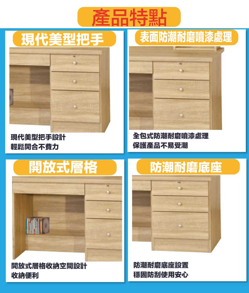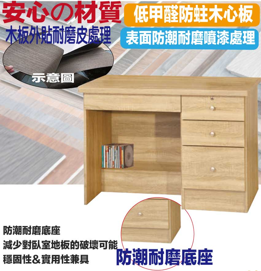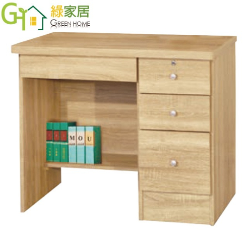 【綠家居】喜鵲3尺四抽書桌 橡木紋色系+安心材質製造,使用放心+搭配居家更便利,採用防蛀木心板+防潮耐磨底座+五金滑軌結構等安心材質製造 ,外層採用防潮耐磨噴漆處理搭配採用四抽屜+開放層格等收納空間設計,全由專人配送到家,專業安心服務,替你省下更多時間!