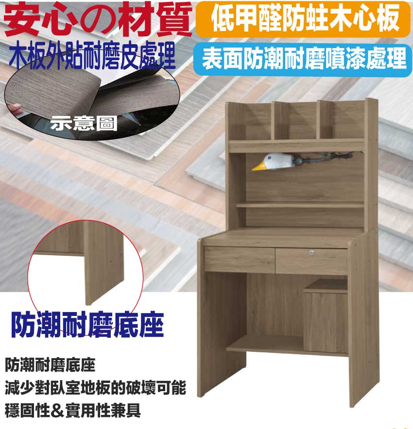 搭配採用可調式護眼燈架+二抽屜+開放層格等收納空間設計