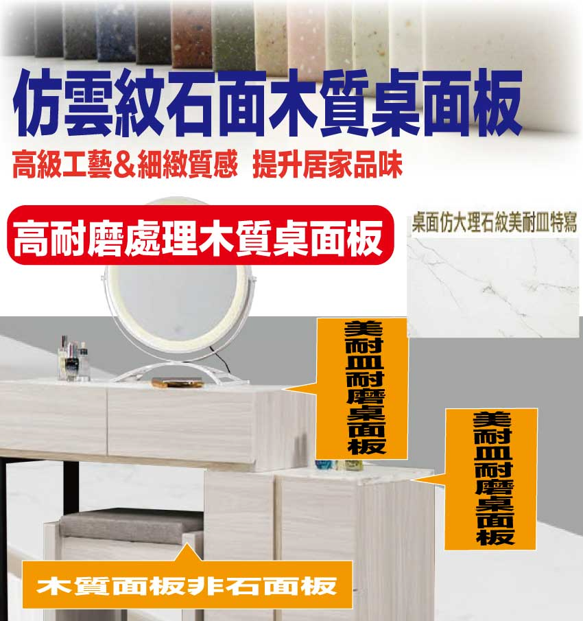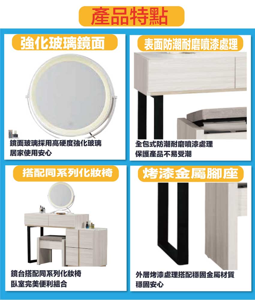 材質:防蛀木心板+防潮耐磨底座+五金滑軌結構+強化玻璃鏡面+烤漆金屬腳座+耐磨美耐皿材質面板